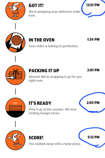 Clearly I did not wait for 4 hrs at the store nor I didn't receive my order at 2:03pm, at 5:12pm, at any:pm.