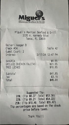 Read moreI have always loved Miguel’s but the experience I had last night 12/14/24 will keep me from returning. I came with a group of friends for my best friends birthday and we had Louis as a server. Louis decided to treat everyone in the group great, except for me! At first I thought I was overthinking it but then my friends mentioned how rude he was being to me. He spoke rudely to me a multitude of times when I was speaking to him normally and thanking him the whole time. He got upset that I ordered a drink different from everyone else’s and then proceeds to bring me the wrong drink. I corrected him because I didn’t like the drink he brought out and he was very obviously annoyed with me and snatched the drink away. It took another 10 minutes for me to get my drink while my friends all almost finished theirs. He would attend to my friends and fill their waters the whole time and never fill mine up or ask if I needed anything like he would my friends. The final kicker of everything was when we went to pay. Again, he was very nice and thankful to my friends and let them take their time paying. When it came to my turn, he SNATCHED my card out of my hand. My friends were shocked and really wanted to say something but at this point I just wanted to leave because I felt so uncomfortable. My friend also asked where the bathrooms where and he said in a very smart ass way “behind you” and scurried off never to be seen again. I would also like to mention that his service is so slow, we were almost there for 2.5 hours and this ruined our other plans we had after dinner. It took us a half hour to get the check, we felt like we were being held captive. The food was pretty mid and the drinks lacked flavored and were obviously watered down. Very disappointed because I’ve always loved Miguel’s and had Louis as a server a few...