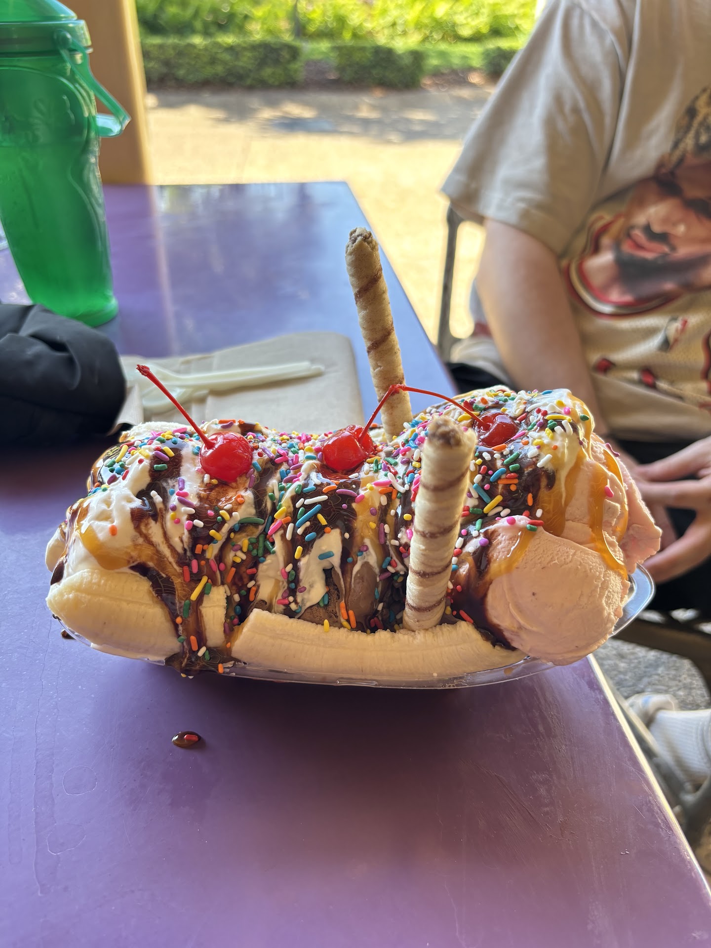 Okay so we were waiting in line thinking oh this icecream would be fantastic. As soon as we got to the counter guy said, "we dont have bananas" for a banana split which was on the menu. Then we said oh lets try something else then like the berry cheesecake milkshake..."we dont have cheesecake".... "or hot fudge". So we decided to try without some of the items... get to the payment register. While waiting we were watching one of the shakes being made the berry one. However all i seen was milk put into a cup with not even a scoop of icecream. The lady puts strawberry syrup in it and just let it sink to the bottom without blending making it look like a vanilla shake with just whipped cream.. this was my moms. I got the whoopie pie... they forgot to even make it so i cant tell you how that looked. My sisters just looked like chocolate milk and tatsed just like milk... we paid 40 dollars for this crap refunded 36 since my sister already grabbed hers. One of the workers just gave up and left after attempting to blend. Another just gave us an attitude As soon as the manager showed up to refund us even she couldnt even tell what the berry shake looked like. How could someone not even mix a milkshake... it doesnt deserve to be called a milkshake cuz it was just milk. Busch gardens do better, we come all the time this was the one place we went to which was horrid and gave me anxiety knowing I could do their job 3x much better. Added bonus: the guy cut a green banana to see if he could use it for the...