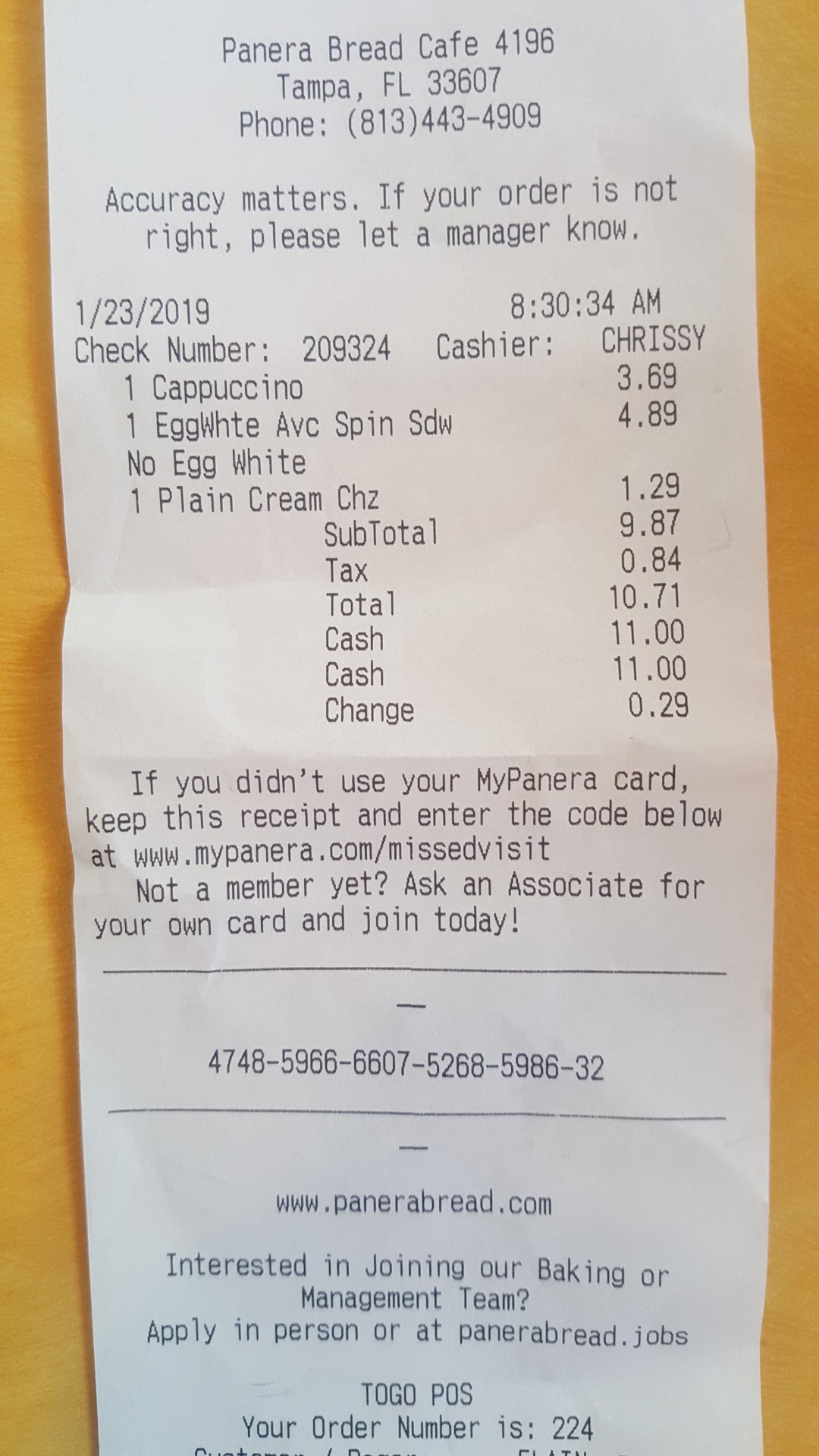 Ā Ā Ā Read moreAs a former employee I must say I don't recommend Panera as a whole but I would especially steer clear of this store. Panera bread often disregards regulation about cross contamination hazards and other health issues. If you have allergies, or dietary restrictions such as halal or Kosher Please do not eat here or any other Panera Bread. The management and majority of associates do not care and if they put bacon in your salad by accident they'll just mix it toward the bottom and hope you don't notice. If you do, they won't refund your meal or show sympathy at all. As valid and important as the health concerns are it's also important to note the moral reason not to eat here. They refer to themselves as "The Jesuit Location" despite being closer to the Stadium and St.Joe's hospital than Jesuit, the All Boys High school down the road. Weird right? Any questions you may have about this will be answered when you walk in and see the staff of all conventionally attractive teenage girls. They hired over a hundred high school girls when they opened this location (and 5 boys to evade suspicion) and slowly let people go not based on work ethic, dedication, or job performance, but by who would "attract client base." They fired any POC, non thin, unattractive, or lgbt person at the store. It was disgusting to watch and be a part of. From what I've heard nothing has changed. Because Florida is a right to work state Employers do not have to give a reason for termination so it was easy for them to get away with. Please keep this in mind and avoid supporting this...