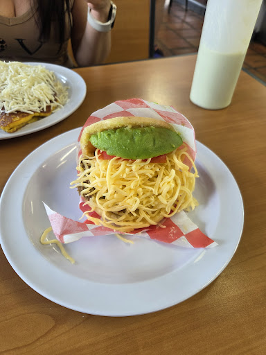 Our orders - an arepa with pernil, sandwich with pernil, cachapa with beef, a side of fries, and two fruit drinks - arrived inconsistently. The fruit juices emerged as the solitary highlight, vibrant and fresh. Water was conspicuously absent until prompted, and the main dishes arrived haphazardly.