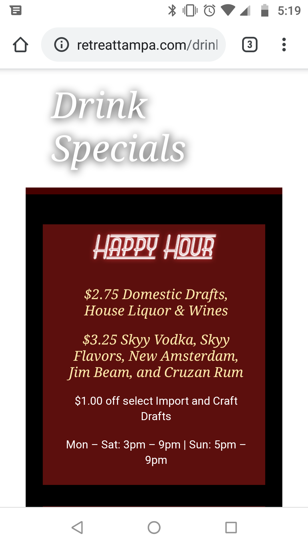 The Retreat itself as a stand alone bar is an entertaining place to go drink. There are deals each night; Saturdays are five-dollar top shelf. The location is just outside of downtown traffic and easily accessible from I-275 South-Exit 5. The place has an indoor jukebox that can connect to your phone. Roughly three pool tables and two dart boards, a couple of cornhole ramps, and a healthy plot of booths and chairs. There are tvs for sport games, and the bar is what you'd expect of a full bar. Scotch, whiskey, vodka, rum, draft beers, and liquors. While all these aspects sound inviting, the employees bog this charming bar down. A bar-back (usually seen with cornrows) is known by many to be rude, prejudiced, negative, and unwelcoming. The bartenders treat their customers as if they are already drunk, and skimp at times on the amount of alcohol they give them. One man of the few seen there working does a good job--friendly, talkative, and generous (blonde short hair normally). The manager is stand-offish, condescending, and treats his customers with a straight face as if to say, "no matter what you say I know you'll come back because of how cheap the merchandise is"--which may aggravate some. If you come to this bar to enjoy a time with your friends, stay clear of the bar, their employees, and get your drinks early on so you don't have to interact with the people there.