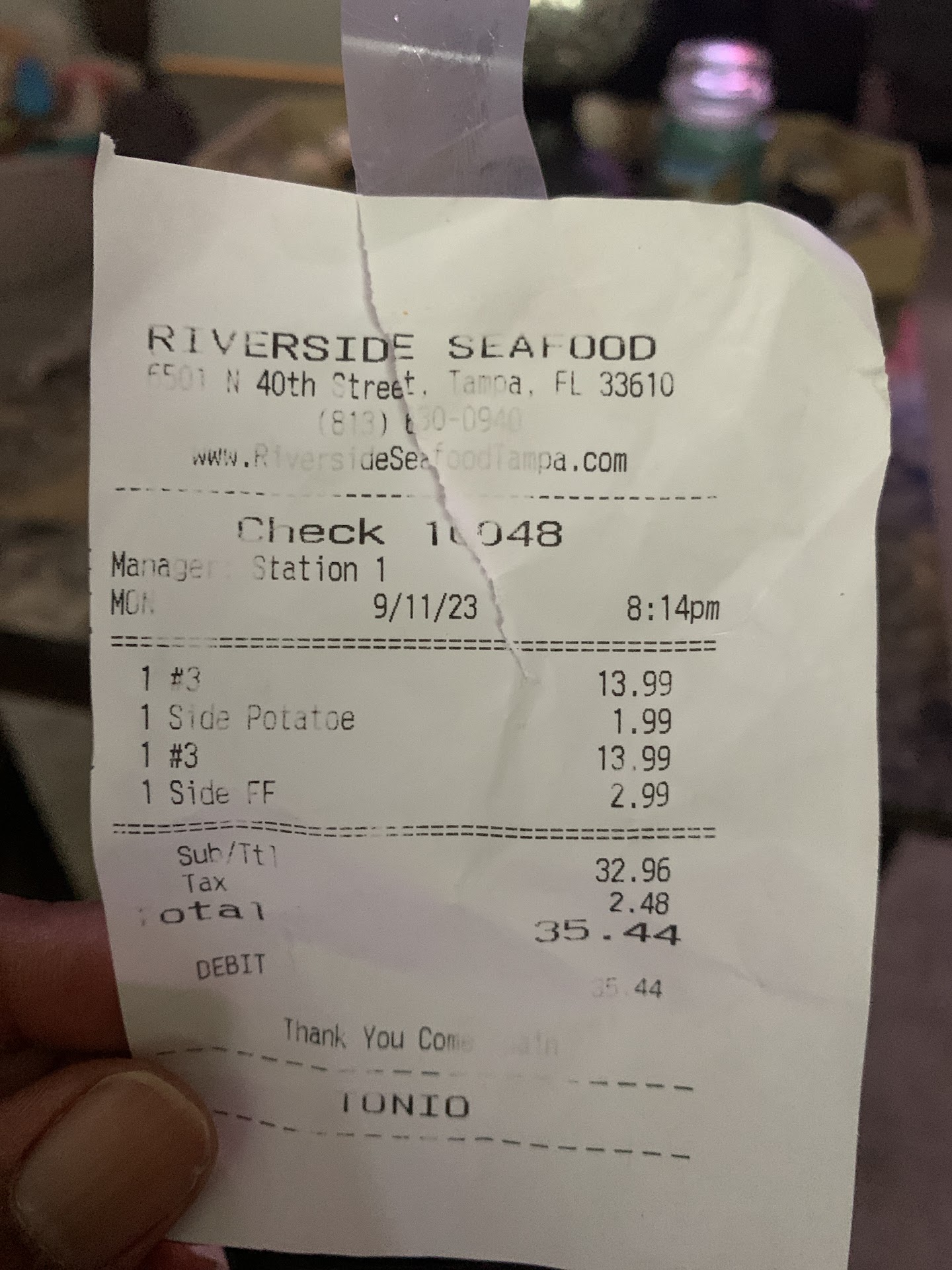 Read moreMy friend and I called Riverside Seafood Restaurant on Sat, 9/15/18 before placing an Uber Eats order, because the order menu on that platform was poorly expressed and a bit difficult to understand. We were reassured by the manager that we could indeed order our items and shouldn't be concerned. We ordered a full pound of snow crab legs and an order of "just shrimp". Under the special instructions, we specifically asked for an extra drawn butter as there were two of us eating. The order arrived in the lobby and we went down to pay and then bring it upstairs. We soon noticed that there were NO dips at all -- no extra drawn butter, in fact NO drawn butter AT ALL. No cocktail sauce or tarter sauce. The "just shrimp" was instead fried shrimp. We called immediately (7:30 PM on Sat, 9/15/18) to respectfully explain what happened (hopefully, expecting that they'd correct their mistake). The man on the phone who identified himself only as "the manager" simply replied, "okay." Okay? Clearly not. I explained the issues again, asking if they'd please correct our order and he was condescending and offered no recourse at all. When pressed, he told me, "If it's such a big deal, drive over here and I'll give you the butter, shrimp and cocktail sauce!" If we'd been in a position to do that why would we have paid for delivery service in the first place? I again reminded him of his position, of the fact that we did not receive what we'd ordered and paid for...who eats crab legs without butter? We didn't order friend shrimp and really wanted the cooked shrimp with cocktail sauce that we'd ordered and he still was completely unwilling to correct their mistake. He was terribly rude. At that point, I asked for his name and he stuttered, "Why? For your bad review?' To which I responded, "That's how this works if you're unwilling to give us what we ordered and paid for..." and then he hung up. We didn't eat any of the shrimp since it was not what we'd ordered. We picked on a bit of the crab legs, but really...who eats crab legs that way? It was a complete waste of time and money. We wound up paying for dinner in the hotel, which we clearly should have done in the first place. DO NOT WASTE YOUR MONEY ORDERING FROM THIS...