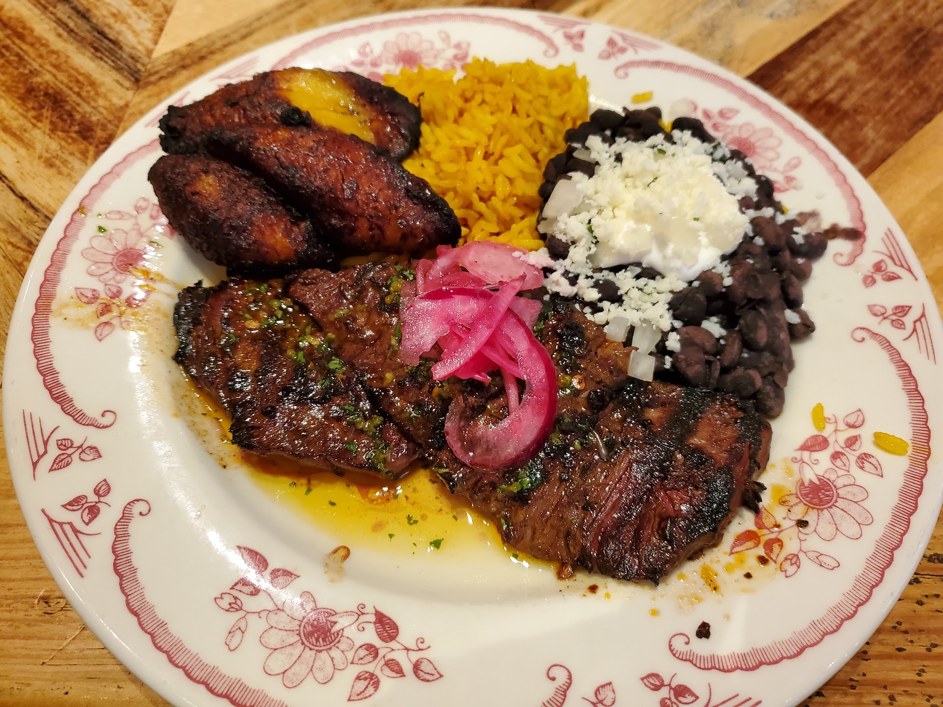 The skirt steak was calling my name. They serve it 2 different ways, and one is a GF option which comes with avocado and sweet potato. I went with "al Carbon" which comes with rice, black beans, and sweet plantains. The steak was marinated and tender. It was also cooked perfectly to order. It was delicious! If I had to say anything negative it would be that the skirt steak was a thinner cut than others I've had. That may have been just me wishing that I had more steak. I certainly didn't need it because everything else on the plate was filling and equally as good. The rice was more of a converted rice. But, I must say that the combination of the rice, black beans, white cheese, sour cream, and chopped onion totally put that thought way towards the back of my mind. The sweet plantains were perfect. My friend also enjoyed her steak tacos which also comes with the rice and black beans. She kept commenting on how good it was as well. She had been there once before and reminded me to try the sangria next time. She said it's one of the best sangrias she has ever had at a restaurant. I'll keep that in mind for date night with the hubby.