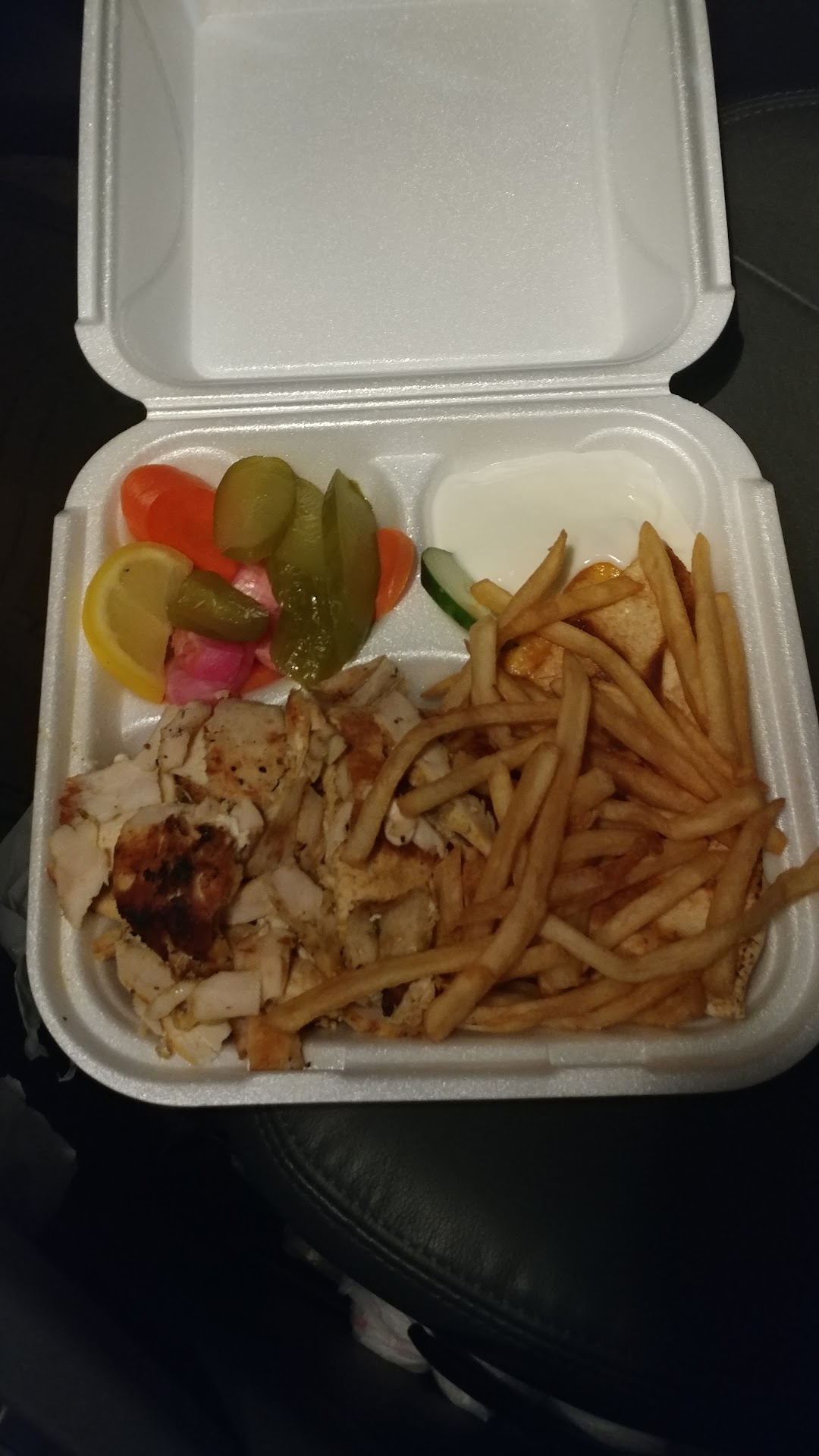 Read moreUpdate/Edit: I pulled off the old awful fries and threw them in the garbage. The rest of the food was delicious! Chicken Shawarma wrap cut into pieces with a lot of extra chicken outside the wrap. Served with pickles and other pickled vegetables, a white sauce, and some folded pita pieces with a red colored hot sauce spread inside. I guess they just didn't have any fresh herbs on hand when I visited. What I ate was very good! I left my first impression review (below) because it shouldn't have been that way.
