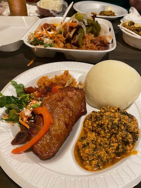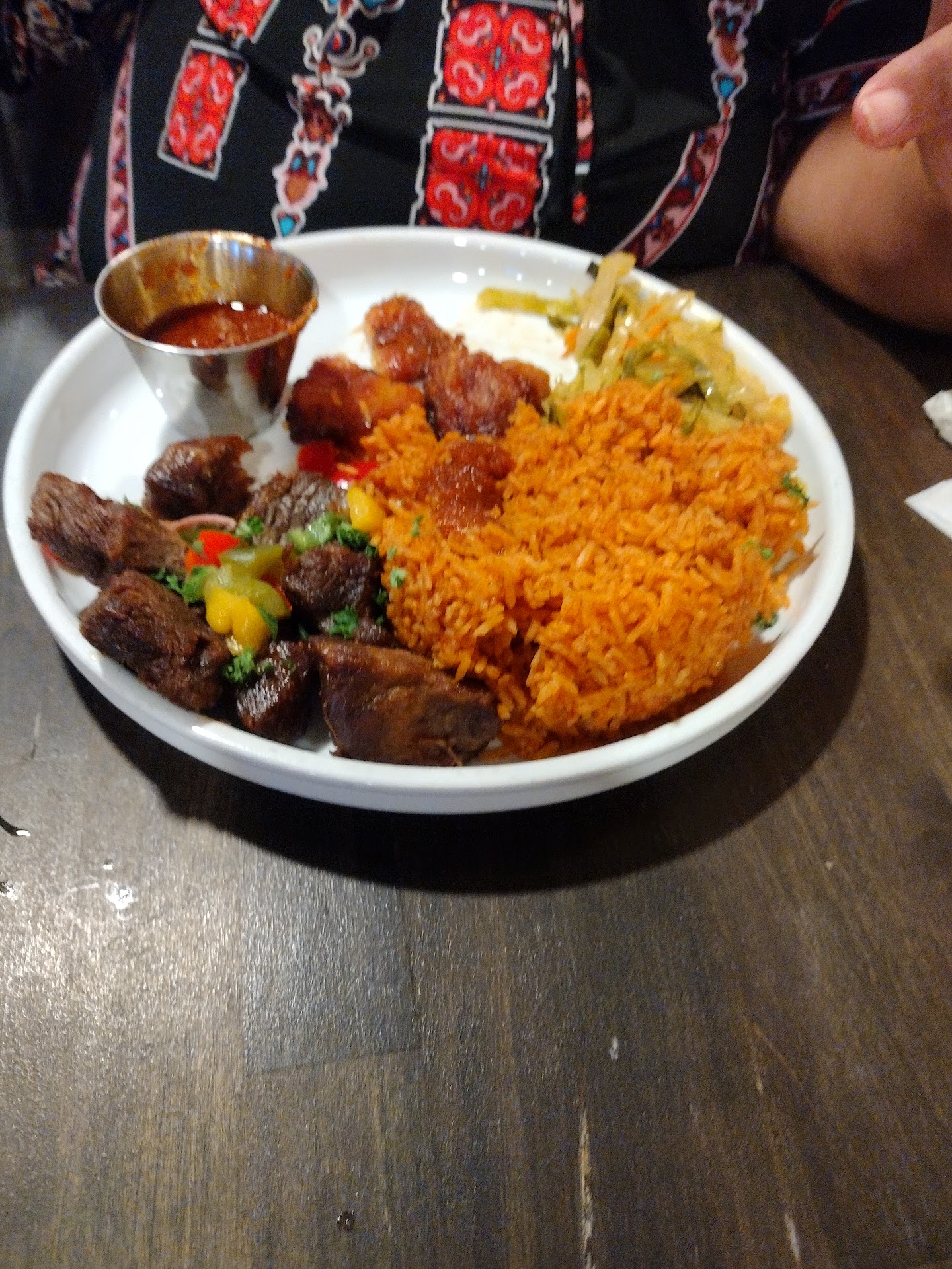 Read moreI heard about this spot from several friends and seen reviews on Instagram, so I couldn't wait to try it and I'm so glad I finally did! I had no idea what to order, except that I wanted to try Fufu. Upon entering we were greeted with friendly smiles by the staff. Once we mentioned that this was our first time the lady behind the counter gave us an overview of the dishes. Eli, a teenager and one of the staff members, took us around on a little tour, to see the lounge and also the patio, which both are beautiful! He took his time and asked what kind of food we liked or didn't like and gave us suggestions. He explained what his favorite dishes were and why they were his favorite. He patiently answered our many questions about, ingredients, texture, etc all while smiling genuinely. He left a great impression on us! We ended up ordering the Egusi with Beef and Jollof Rice with Fried Turkey and also some Puf Pufs to share. We loved each and everything he suggested, and it was actually too much food to eat there, so we had a nice portion left over. The Egusi and Fufu was an experience to eat with our fingers. While the Fufu has no taste really, toether with the Egusi everything was so flavorful and seasoned. Eli explained that it's cooked with fish stock (I think) to add flavor and he was right, it gave it an amazing flavor. The Turkey wings were fried and seasoned perfectly, with a crunchy skin and tender juicy meat. The Jollof rice, was my favorite. It had a tomato base and together with the fresh sauteed peppers and onions, it was simply delicious. The side salad was a fresh addition to the plate. Lastly, we tried the PufPuf, which were nice and fluffy and not too sweet. However, we were so full we could barely take one bite. All in all, I loved the entire experience, the establishment, the staff, the food, the vibes (Afrobeats playing in the background) as well as the beautiful decor! I will...