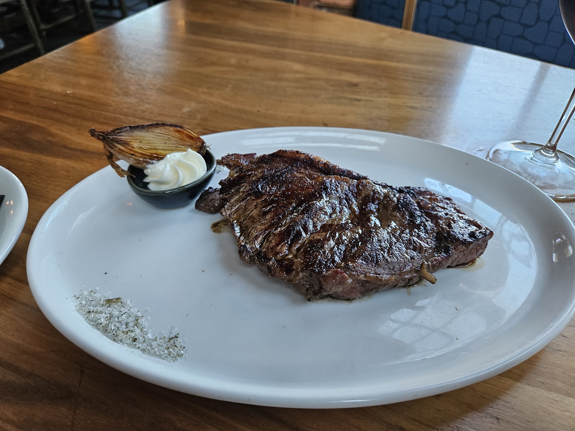 15 minutes later, I received a slightly-more-than-medium steak. At this point, the potatoes were cold, and I didn't feel like waiting another 15 minutes and wasting the meat, so I settled. The steak itself was fine. Not trimmed at all, with a massive chunk of fat along the side.