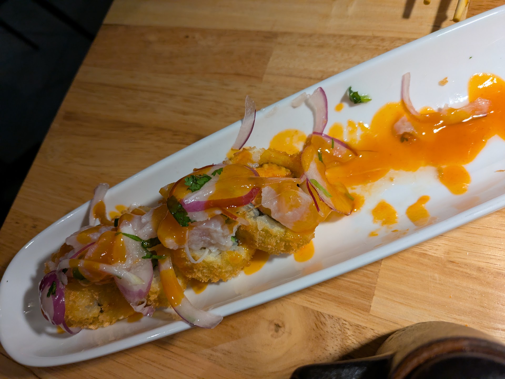 The owner, Michael had come by our table to ask how it was and I mentioned that when I think of ceviche, I was missing a little more kick on the roll. He had mentioned that someone had asked for Sriracha on the ceviche roll instead of the mango sauce and I said they could even be mixed... This lovely man brings back yet another forearm of Ceviche Roll this time, with this gorgeous orange, sweet and spicy sauce across the roll and THAT was exactly what it needed. We were so excited, we each took a piece before remembering to take the photo! My friend does not like spicy and even admits that this flavour was perfectly balanced! It was absolutely delicious yet again and with that extra little bit of love from Meylin, their WILDLY talented sushi chef.