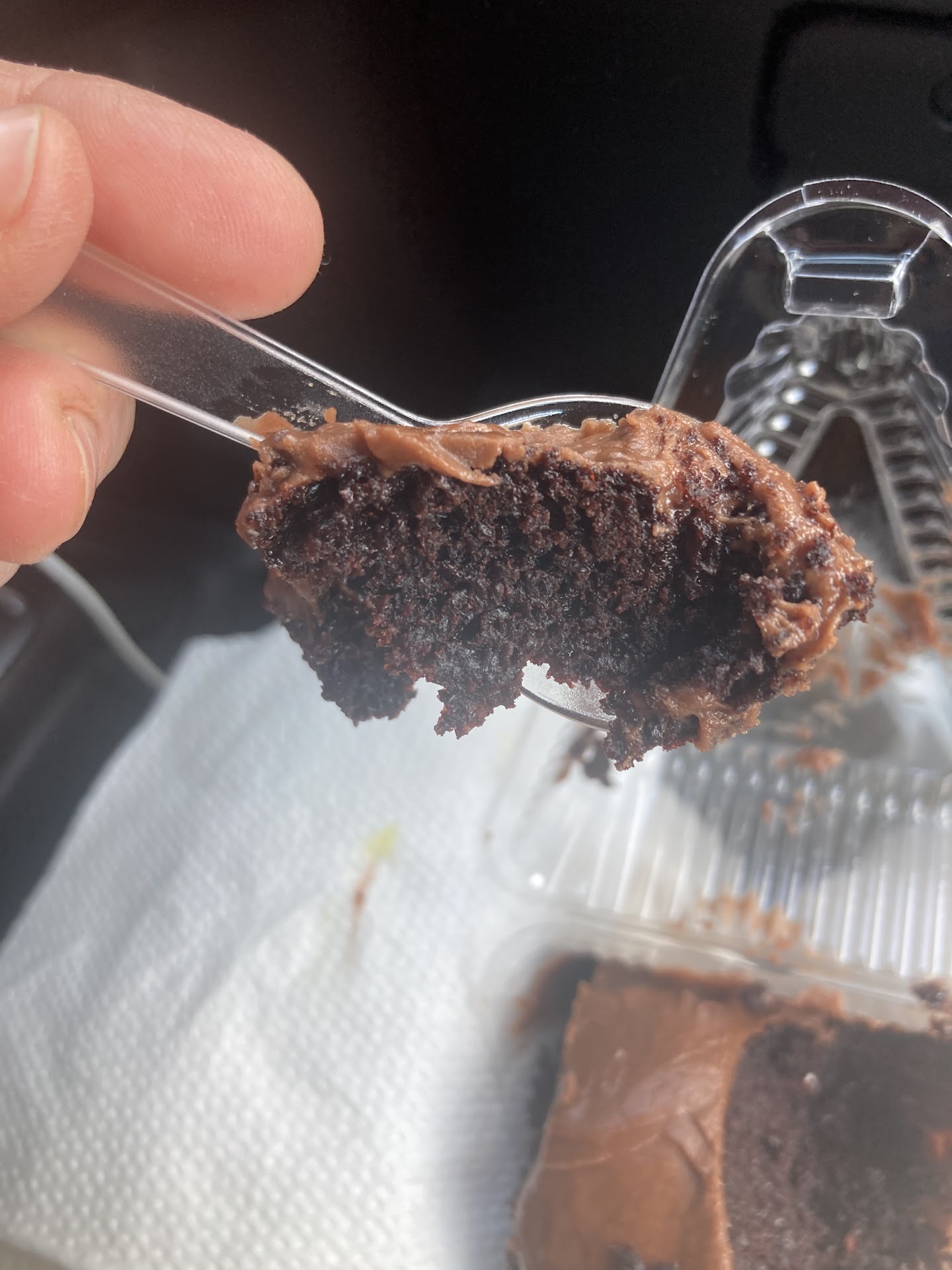 Chocolate cake was so good I got nervous it might have dairy in it. Surprisingly good! It was like eating a traditional devils food cake with real frosting. So moist you could eat it on its own, but dang! The frosting was smooth and rich too.