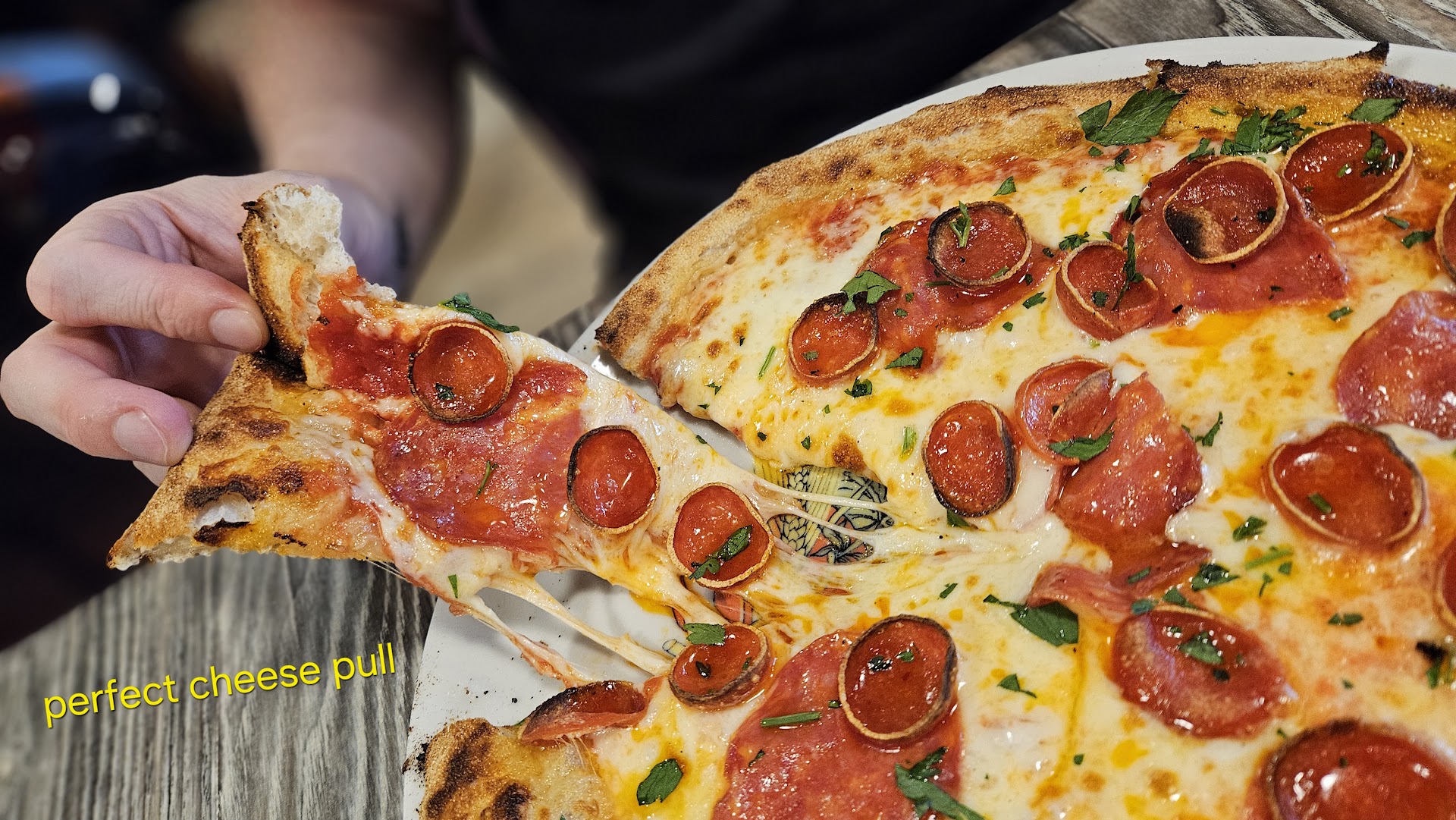 Onto the woodfire Pizza. This is why we came. We ordered the 12" Double Pepperoni and 12" Quattro Formaggi (vegetarian). Crust was amazing. Perfectly fired. FRESH ingredients. Amazing cheese. Husband says red sauce was "ok" on the Pepperoni and my Formaggi was all cheese so no sauce. Overall, we both thought there could've been more flavor to the pizzas... needs more oregono and garlic.