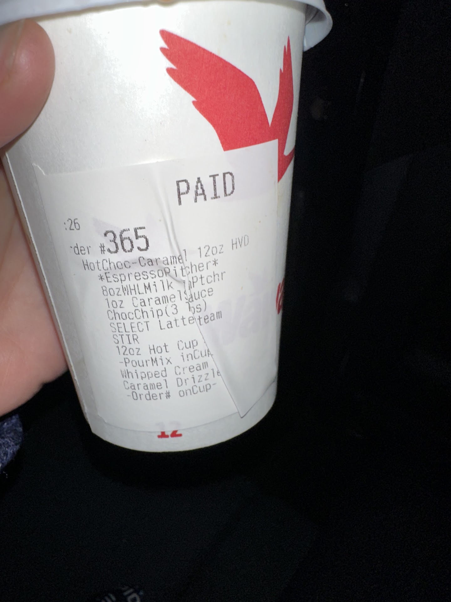 Read moreOne star for service on the people who made our drinks. Both me and my sister had separate orders (both with hot chocolate) and when we received our drinks it said âExpresso Pitcherâ and we all tasted coffee in our hot chocolate. Neither of us added coffee to our hot chocolate nor did it show on our receipt where we paid for them. When we brought it up to the attention to the people making our drinks after we received them it sounded like the one more in charge was explaining to the girl that she wasnât supposed to put coffee in them. After standing for 5 more minutes (AFTER she said they would remake them) she said that the girl didnât add coffee in them and that if we wanted a new drink we would have to re-pay. Why should we have to re-pay because you made our drink wrong? She just said that because I think they were lazy and didnât want to remake it. Iâm definitely not ordering drinks from this location again. Yaâll need to watch your employees based on all the other reviews people wrote, not looking...