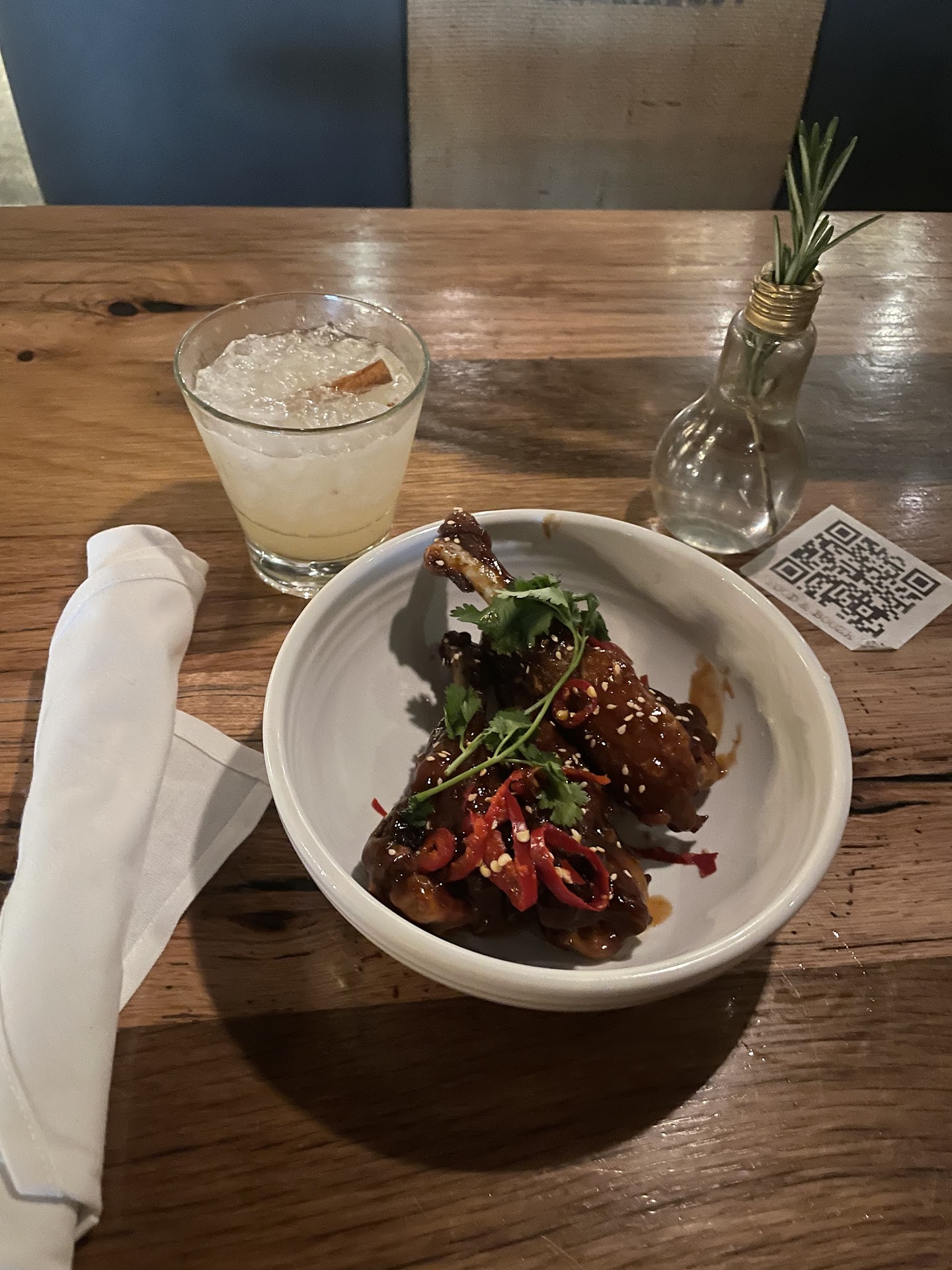 Read moreWow! I was very impressed with this restaurant. When I entered, the restaurant was nicely dimly lit and the vibe of the restaurant was very relaxing and inviting. I started with a figgy smalls gin cocktail. I love a good gin cocktail, and this place surely did not disappoint. This drink was made with Amsterdam gin, a touch of cinnamon with subtle fruit notes. It was so good that I ordered 2. I ordered the Thai BBQ duck wings as my appetizer. Now these were incredibly yummy. The duck wings were tender with a crispy skin. The sauce was sweet yet also had a bit of a spice. It was a very good balance. I then had the whisky braised short rib as my main. This was so delicious. The short rib was incredibly tender, not tough at all. It laid effortlessly on a bed of horseradish potatoes, tender roasted carrots, and sweet pearl onions. This was my first time having horseradish potatoes, so I was a bit unsure if I would like them. But, wow! I’m so glad I tried this. No regrets. I ended the meal with dessert. I, of course, ordered the whiskey cake. Y’all have to order this if y’all visit this restaurant! It’s a sticky toffee cake with a bourbon anglaise spiced pecans. This cake was so decadent, moist, and it’s served warm. My tastebuds were having a party at this point in the meal. And they serve this delicious cake with house made vanilla whipped cream! Wow! It was so thick and buttery. I’m salivating just thinking about this whipped cream!
