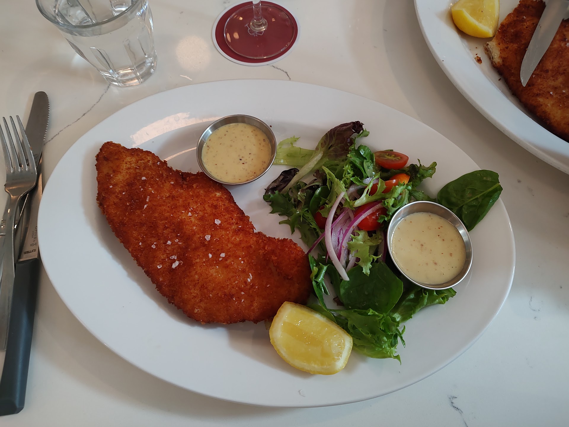 Read moreWe will not be going back. We were excited to try Wiila's restaurant based on recommendations to go there, plus having read the story of the ownership of the female co-partner. We (hubby & I) arrived at 5:00 on Saturday. Our car and our brother's (&wife) car was the only one in the lot. Parking is in the back. A nondescript dull gray building.We walked around to the front to enter. We entered and were greeted pleasantly. We were sat to the side in a booth facing the bar and not the street. We had the pork belly Disco fries - two orders for two couples. Now THESE where divine !!!! SO very, very delicious ! The drinks were : one iced tea, two sangria's and waters for all. The table next to us was given a water carafe as a refill, we were not. The sangria's were 3/4 full in a wine glass filled with ice. I prefer my sangria chilled and not served over ice in my wine glass. The entrees for the table were : two "chicken" schnitzels, one steak frites and one rotisserie chicken. As you can see by the picture the "chicken" schnitzel only had a salad-esque "garnish". That was the "garnish" on the rotisserie chicken plate as well. The steak did have a handful of delicious -looking fries (the same that were in the pork belly Disco fries, I'm sure). The "chicken" schnitzels were tasty but not outstanding. They arrived at room temperature not hot/fresh off the grill / fryer. Why "chicken" schnitzel, instead of pork schnitzel ?? There was no complimentary bread & butter served at the table with the meals.* Frankly I was still hungry after my schnitzel plate --- which cost * $22 * . We did order a slice of strawberry lemon cake. It was a nice sized slice - but the cake was very dry, the icing was reminiscent of strawberry flavored cooled whip. The center - between the layers of the cake - had strawberry jam in it. There was lemon curd in a dollop on the plate.