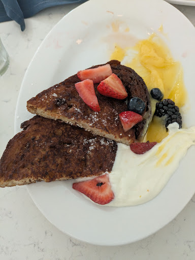 Sourdough French Toast. I have never in my life had a culmination of exquisite independent flavors as was in one bite with these ingredients. The French Toast itself had a crunchy exterior, with a twinge of sourdough that one would anticipate, but then a split second later a sweetness that supported, but not overwhelmed, the bite. And that was just the bread. It is served with ricotta, but a bitey, creamy ricotta. And the lemon curd puts all other lemon flavored things to shame. Texture was that of a lemon pudding. Sour. Lemon up front. No doubting it's ingredient. And berries. :). So, if you've been paying attention, a bite with all of these was powerful: crunchy French Toast with a punch of lemon, subtly calmed with a creamy ricotta, then finished with a slight sweetness. There should be a movie based on a book about this Sourdough French Toast. Magnificent.