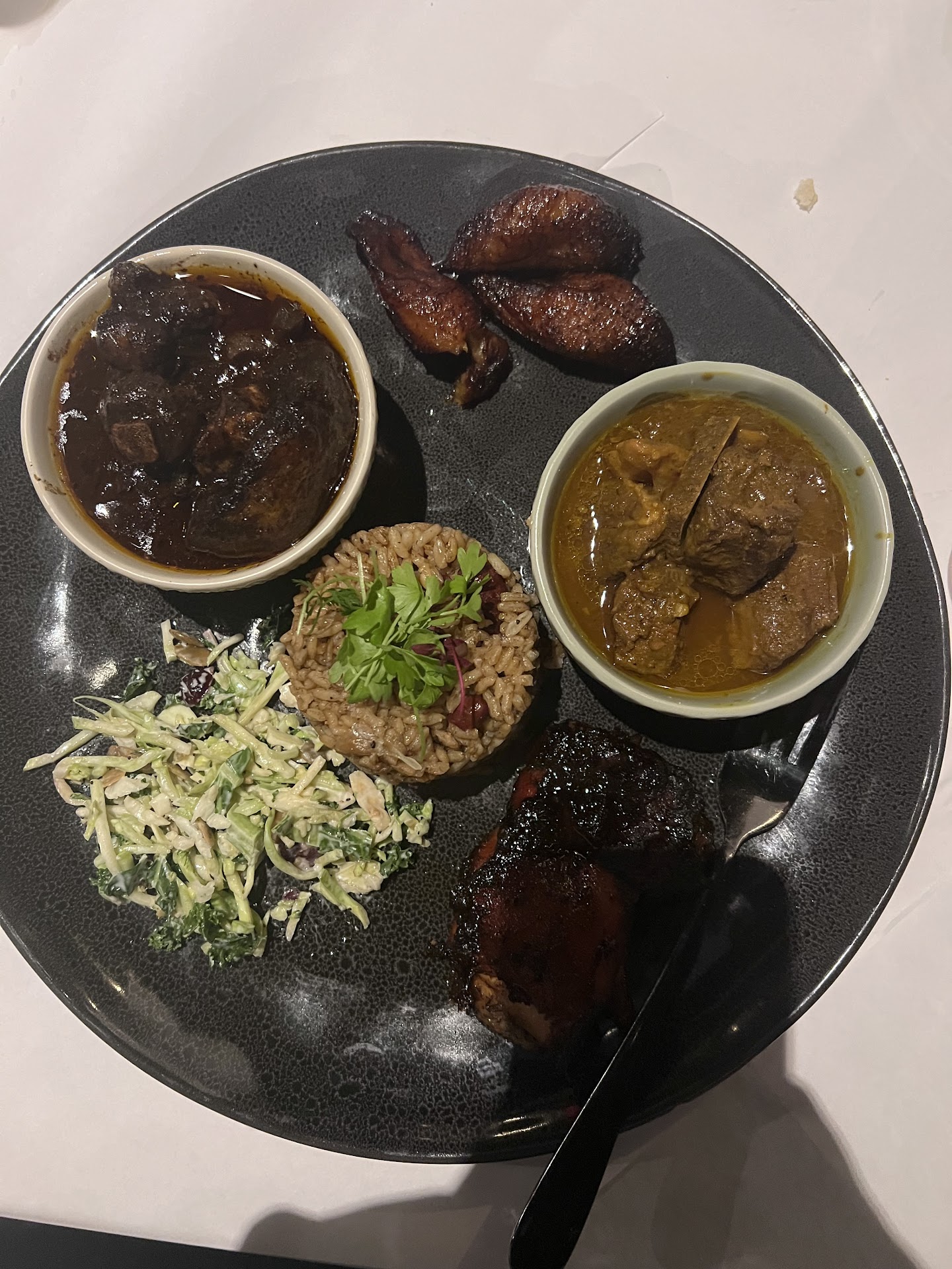 My husband and I found this place by the sign out by the road and decided to give it a try. We were greeted by a welcoming and charismatic man and taken to a table. The place was nice and clean but empty of customers. We were informed that the menu was only available on their website, so we took a look and ordered a Coke ($7), a Diet Coke ($7), the (8) jerk chicken wings ($15) and the coco bread ($7) to start, at the recommendation of the server. Both were a good choice. The wings were tender, fall off the bone and seasoned well with a building heat and the coco bread was fluffy and buttery. My husband then ordered the curry goat ($39) and I ordered the oxtail ($39) for our entrees. Both were tender with good flavor, but the oxtail gravy stole the show. Deep brown in color, not too much oil rendered from the oxtail fat leftover and cloves of garlicky slow cooked goodness. The curry goat was definitely lacking in our opinion, but we couldn’t place what was missing, it was just a pasty, almost grainy texture, but still tender. The rice and peas and the plantains are always a good side dish. Overall, it was a nice experience and the service was top notch, as I would hope with an automated 20% tip for all checks (this wasn’t told to us directly, but is on their website when you go to look at the menu).