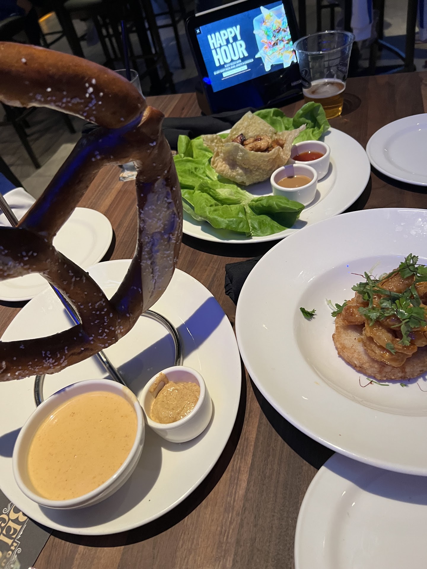 To start the atmosphere was appealing. Behind the hostess counter was the rows of kegs. It was a very modern establishment with tons of beer on tap along with a beautiful combo of elegance and home feeling. That very warm pub feel you want! The menus were clearly well thought out as far as selection and material (not cheap) I also loved how our booth was āraisedā on a platform where other booths were along the wall. Just enough to again keep that pub vibe. 5/5 so far so good!
