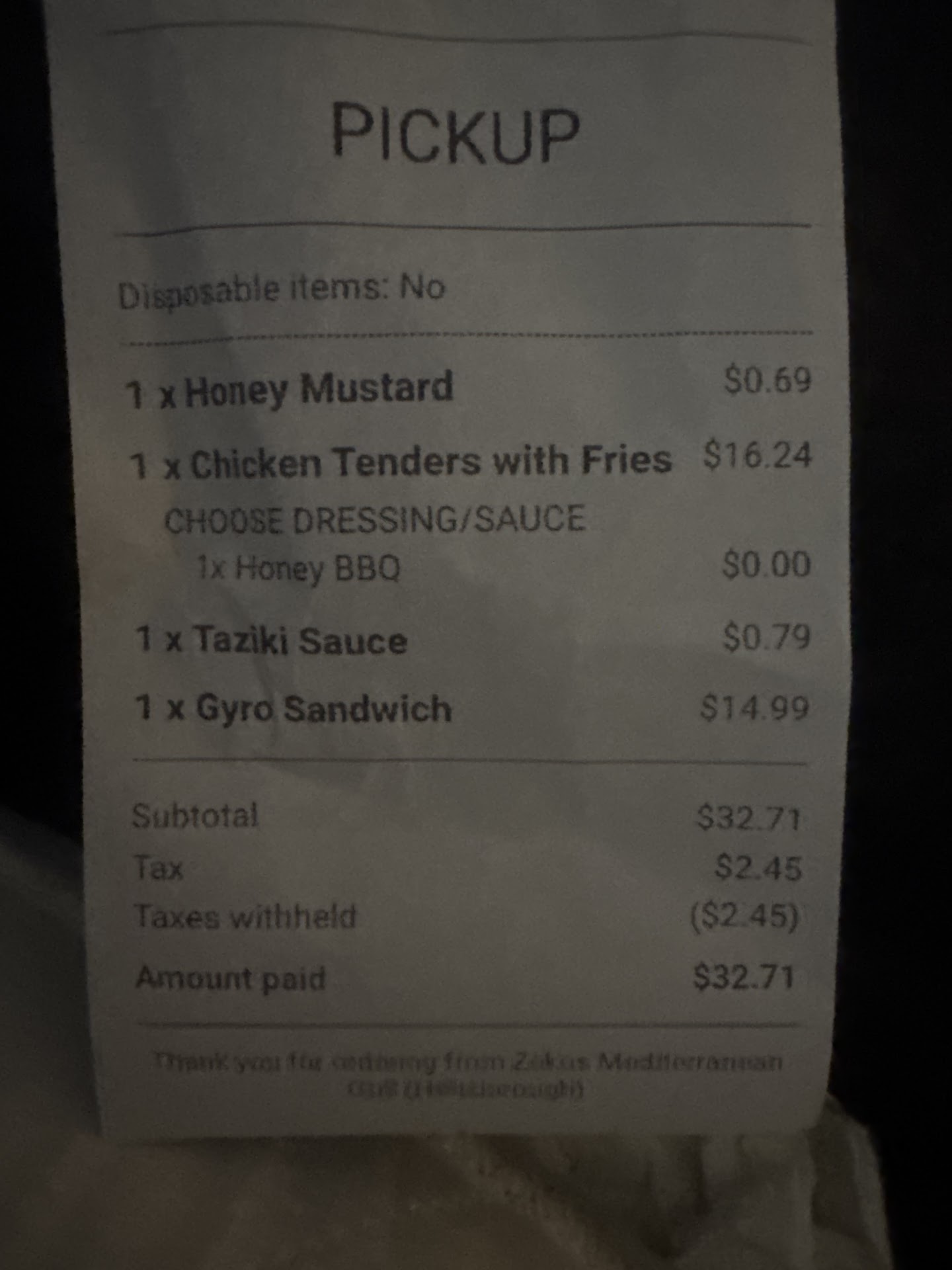 I took our uneaten food (minus some fries and part of one gyro) up there a couple of days later at lunchtime, explained to the manager there, and asked for a refund. Manager said they were the one working that night and that nobody told them anything about this. Gave me a refund, though.