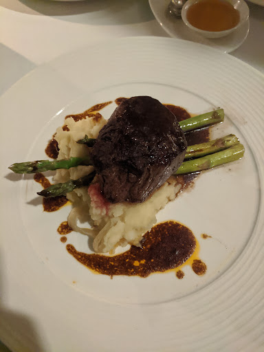 Main course was unfortunately underwhelming. Steak was tasty, fish was rubbery and bland. They dropped one 9oz steak and fish in one skillet which we had to split ๐คฆโโ๏ธ they should have cut it in half and placed it on separate plates instead of us having to cut it ourselves and drip on the table while distributing the portions to each other. This was probably the most disappointing presentation of a main course or meal to be honest.