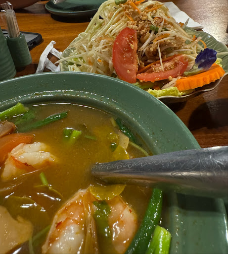 Read moreFood lacked flavor, depth, and portion sizes. If the owner is reading this, please at least fix the papaya salad! The worst dish we had that night. Had no flavor at all. Just the taste of chopped peanuts. Other dishes we tried that were just not as good as it could be (some based on our personal preferences, we could admit) was that the Tom Yum needed to be more sour and it was a bit too salty. What is not a matter of opinion was that the prawns in there were way too overcooked. In the green curry, the vegetables perhaps needed to be cooked a bit more in the sauce. Some of the veg came out a bit rubbery (specifically, the eggplant) and not cooked enough. I also ate here on another occasion and had the fresh spring rolls⌠the wrapper was hardened, not palatable, and indicated that they indeed were not fresh, but rather old and past their due date to be thrown out. Our server was so nice though and tended to our needs. Facility seemed pretty clean. Restrooms are available, and had soap and paper towel at least. That doesnât weigh as much if the food doesnât deliver, though. Overall, could be...