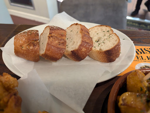 Got the buttered mushrooms, fried chicken, potato bravas, shrimp al aljillo, and had some bread that was recommended to go with the shrimp. It's all very fresh, piping hot and cooked to order (kitchen is basically in the front so you watch them cook).