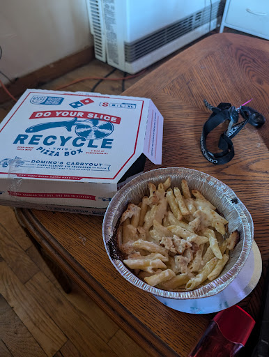 I’m giving 2 instead of one star because at the end of the day it still tastes okay after we add what dominoes forgets. Every time we order something is wrong or missing. I’m tired of getting wrong food that we pay for, it’s a big treat for us to eat out. First it was missing sauce cups for the Cinnabread and no ranch for the wings. We paid extra for these and didn’t get any! This happened 3 times. Also, every single time we get a pizza here they forget to add the garlic sauce that goes on at the end( we used to work at dominoes and know how it’s made) so we’re left with dry pizza that’s kinda tasteless. Lately they haven’t been baked all the way through. Tonight we actually got RAW wings that we had to bake for another 15 minutes AND our pizza wasn’t even cut. No sauces (which we paid extra for) we’re in our order. Get your stuff together dominoes. There were 10 employees there tonight yet our order was still wrong…can’t claim worker shortage this time. Pic is after my husband cut and bagged the leftovers....