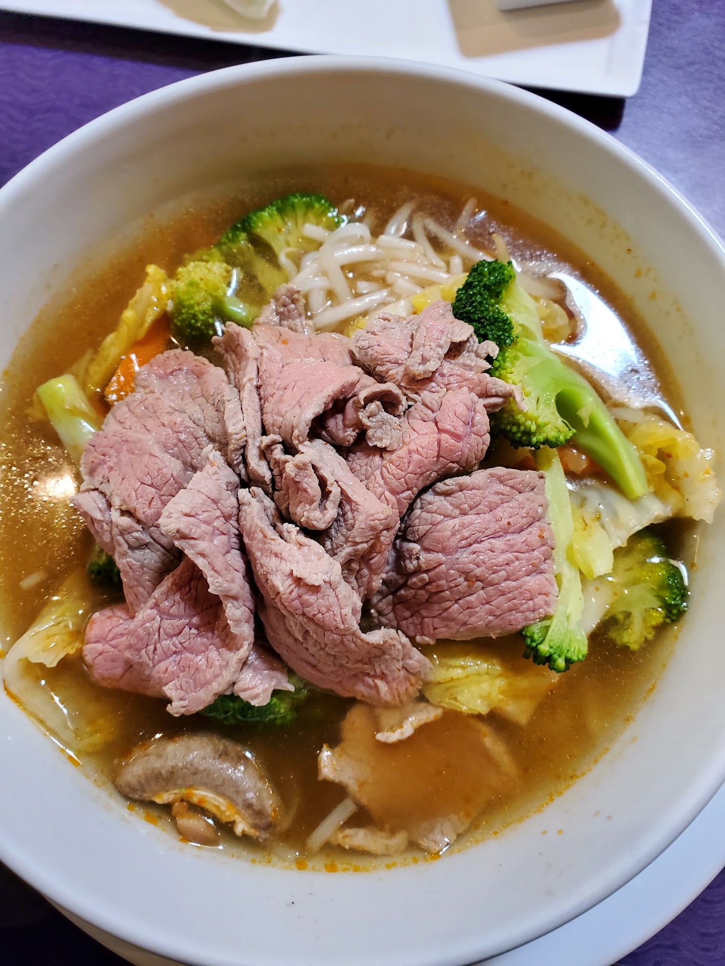 The broth tastes similar to boxed supermarket pho broth. It has hints of proper pho broth but in reality falls very short of good proper pho broth. Now... this place IS NOT a pho place, and so I'm willing to concede they do sushi etc much better. Proper pho broth takes hours to make and requires proper spices and bones etc etc. Either they are doing it wrong here, or, they dont have the time or customers that require a good broth. The place itself is very nice and service appears top notch and the place is packed and they are running their feet off and they are exceptionally friendly so i rate the atmosphere and service highly.