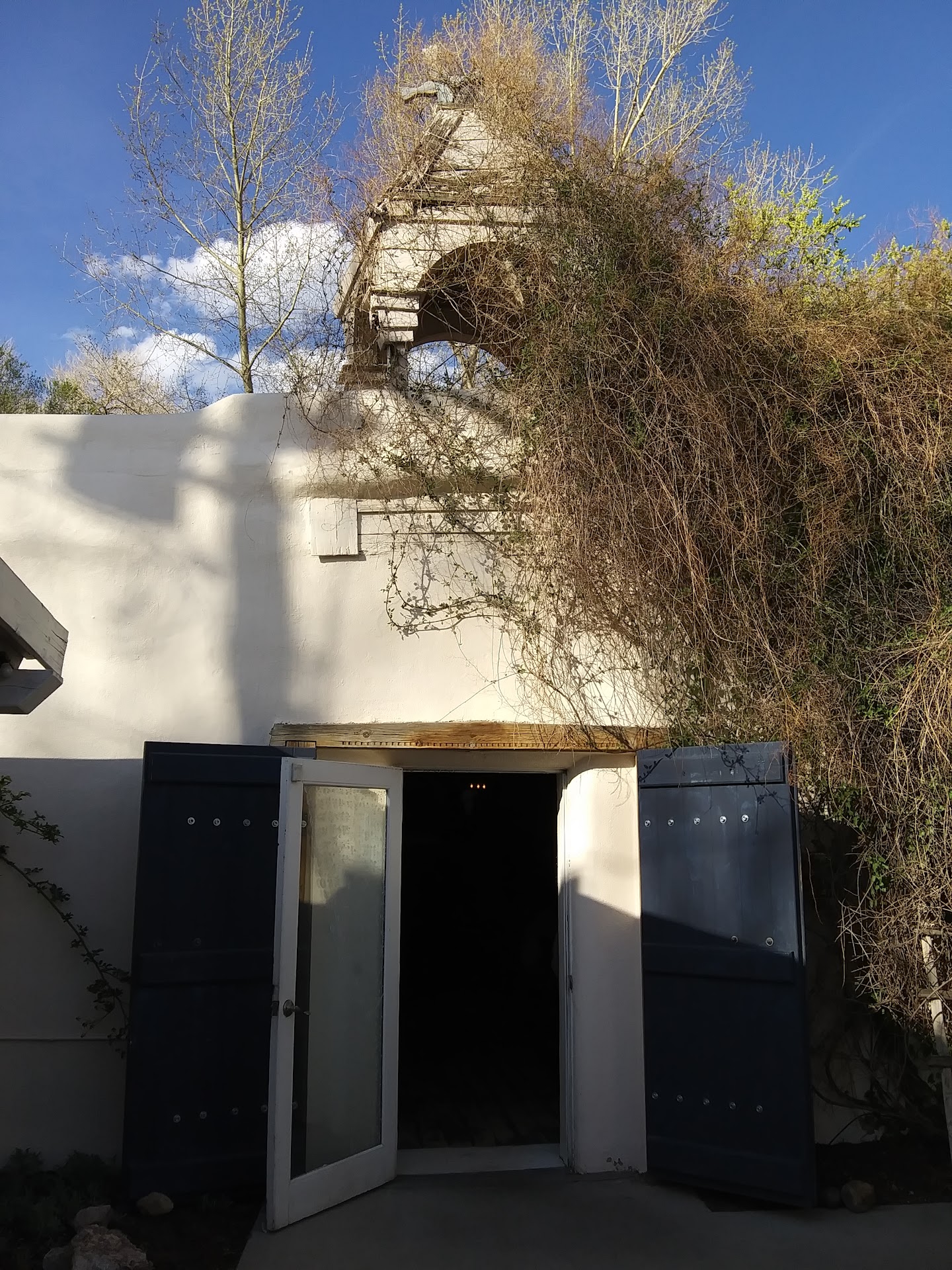 What a great place! The architecture has been lovingly preserved, with the traditional walled courtyard and the original steeple still in place (though a little canted). Sylva met us at the door with a welcoming smile and virtually radiated light. She said we could look around and then meet her back in the courtyard as she might have a table available. And she did! She seated us at a 5-top in the middle of the raised platform where the altar used to be, "because you love this old church as much as we do." She even brought over a book of black and white photo plates from the Southwest, and one of them was the old church when it was still a sanctuary, back in the 1940s. We were both still in our traveling clothes, but she said it was fine. How accommodating!