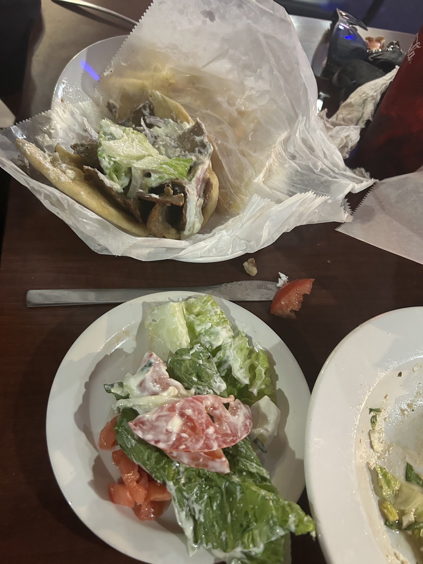 This was the worst dinning experience that me, my girlfriend, and my girlfriend’s sister have ever experienced. The server we had didn’t care about any of her tables other than the one big group she had(there were only five tables being used at the time and one server in the restaurant). We completely understand that sometimes people have rough nights, but any time she worked with this group she was very personal and caring. However, when it came to any other table including our own, our conversations were short and never personal (FYI: I can’t say the servers name because she never told us her name). We finally got asked what we wanted to drink after sitting down for more than 15 minuets after watching her run around taking care of the one big table. When it came to our appetizer, the saganaki wasn’t brought out until 45 minuets after being ordered!! When the server came out with it, she said, and I quote, “here’s your bread here’s your cheese opa”, and proceeded to run off to the big table again. The saganaki was over cooked and couldn’t be easily torn apart like it should. When it came to the entrees, they weren’t the best either. I had ordered a gyro with shredded lettuce and diced tomatoes. The server then told me that they don’t have shredded lettuce and diced tomatoes. Now I’m no expert, but you can literally take a knife and dice up a tomato and presto, you have diced tomatoes. And the kicker was the fact that she said they didn’t have shredded lettuce and she had given me a salad with shredded lettuce (see picture below). I had to take off the lettuce and tomato because the gyro was falling apart and the lettuces was a entire leaf of lettuce, making basically impossible to enjoy. The gyro was also smothered in Tzatziki sauce, so it was basically an overall mess. Overall, the food didn’t taste bad, the majority of our issue was with the server and the minimalist effort she gave to us and the other tables around us while we watched the one big table be given the most amazing service. To conclude, we will never come back to this establishment when we are...