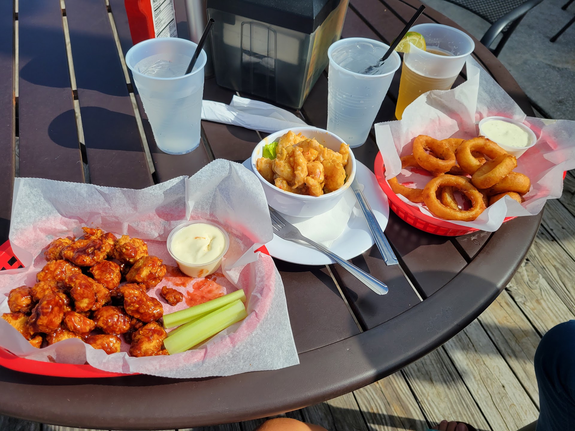 Read moreTook over the "shrimp wrecked" restaurant space on the water. Extremely slow service, friendly and accurate, just very slow. We were there nearly 3 hours and only had 2 drinks, even getting water was slow. Wait staff overwhelmed. Had dozen raw, big plump oysters $18 very good price. Generic watery cocktail sauce though. Bang bang shrimp were very good. Smoked fish spread good, ask for lemon wedge to squeeze on it. They serve with saltines, would be better with captains wafers. Main meal Had Mahi Mahi, shrimp both blackened and a crapcake. Served with cocktail sauce which goes with none of those items and Dijon for crabcake. WAY too much blackened seasoning on shrimp. Fish was a little dry w/too much bite but taste ok. Crabcake average, priced fairly. I absolutely would not order the coleslaw. Almost dry, zero flavor at all. More like a bowl of slightly damp cabbage. Pina colada watery, too sweet and ice chucks, not blended enough. I'd recommend sticking to beer. They need to invest a little in better condiments. Everything was generic and watery. Overall I would go back to try some more items. Decent, just not great. I would go if I could walk in and sit within 5...