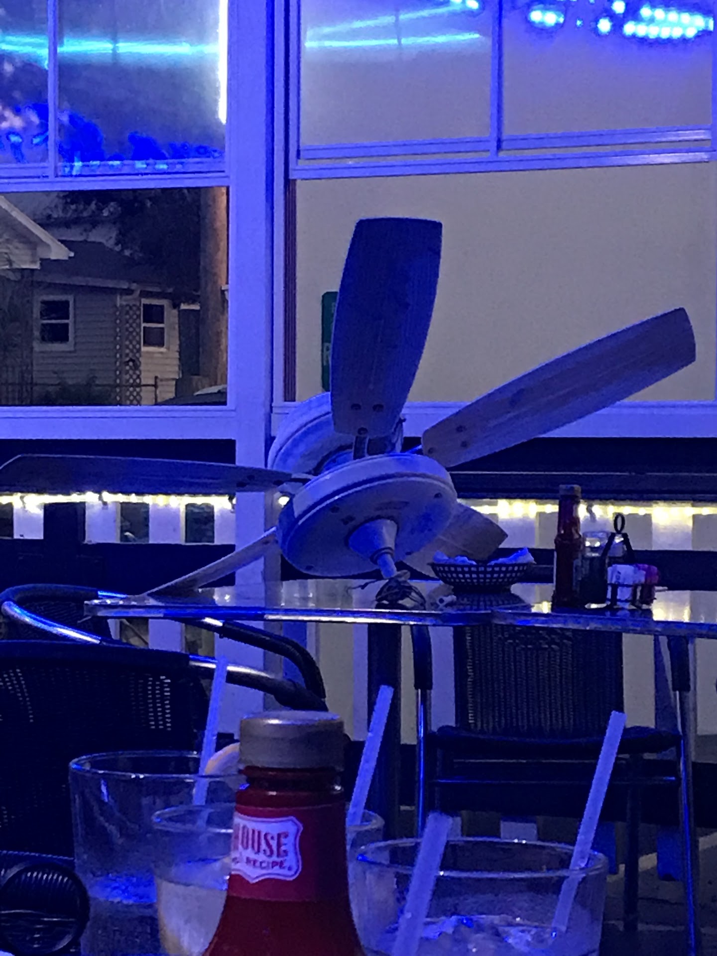 As we’re waiting for everyone to finish the appetizers, and their salads and soup a bus boy went to pull a light on a ceiling fan that then fell on a table.