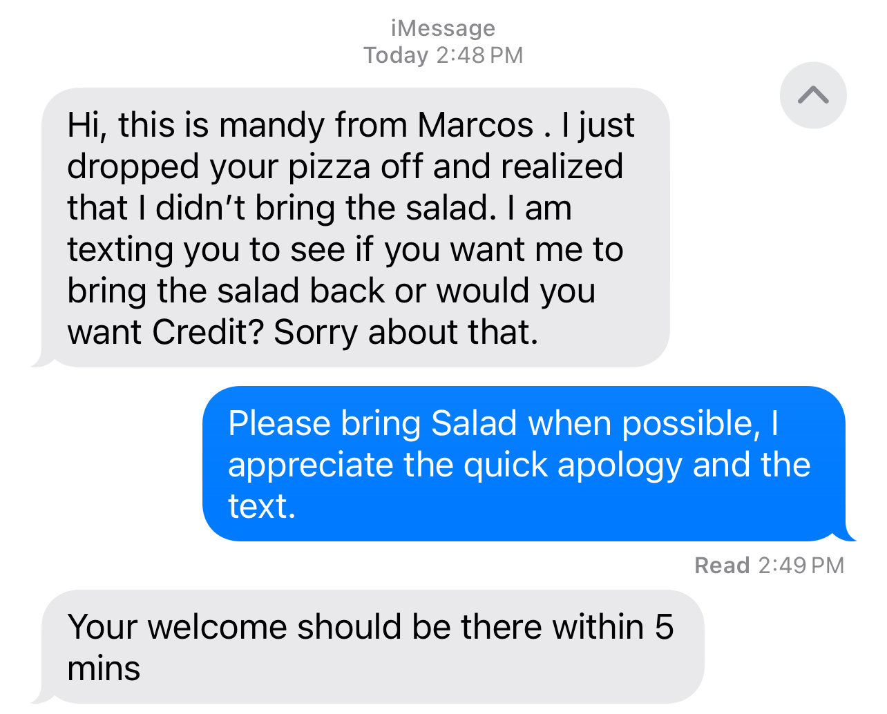 Ā Ā Ā Read moreI don't often write reviews but this experience today was unbelievable. I ordered 5 pizzas and upon arriving only 4 were made. I asked what happened to the 5th pizza and the young lady in the back in the kitchen mentioned it might have been mixed with another order.𤦠So I waited about 8 mins for the pizza to be made. Meanwhile, the other four were still sitting on the counter going stale and cold. š„“Once the pizza was done my sister asked how long ago the other pizzas were made since we waited 8 extra mins. We were told about 5 to 8 mins (That's a total of 13-16 mins of those pizzas sitting on the counter.š®). I decide not to make a fuss about the other four pizzas. Upon arriving home (I only live just a few mins away from Marcos) I open one of the pizzas that was on the counter. It was two topping chicken and feta. I only saw about two little tiny pieces of feta on that pizza the rest was nothing but only chicken. So I drove back to Marcos to ask if they can remake the pizza and add feta. The shift manager refused to make me a new pizza not considering the fact that he made me wait for the fifth pizza and the fact the other four were getting cold and the bread getting soggy in a closed boxed pizza. So the only thing I could do was asked for a refund. I am very disappointed for the lack of customer service. I have been a faithful customer since day one of the store opening but with this experience I no longer going to support this local business. To the Store Manager, Business Owner please make sure your employees, especially, your managers are properly trained to communicate with their customers in a kindly, courteous, understanding, caring manner as I felt like the situation was not dealt properly and I was ignored. The rude response I received today was not okay. UPDATE: I NEVER...