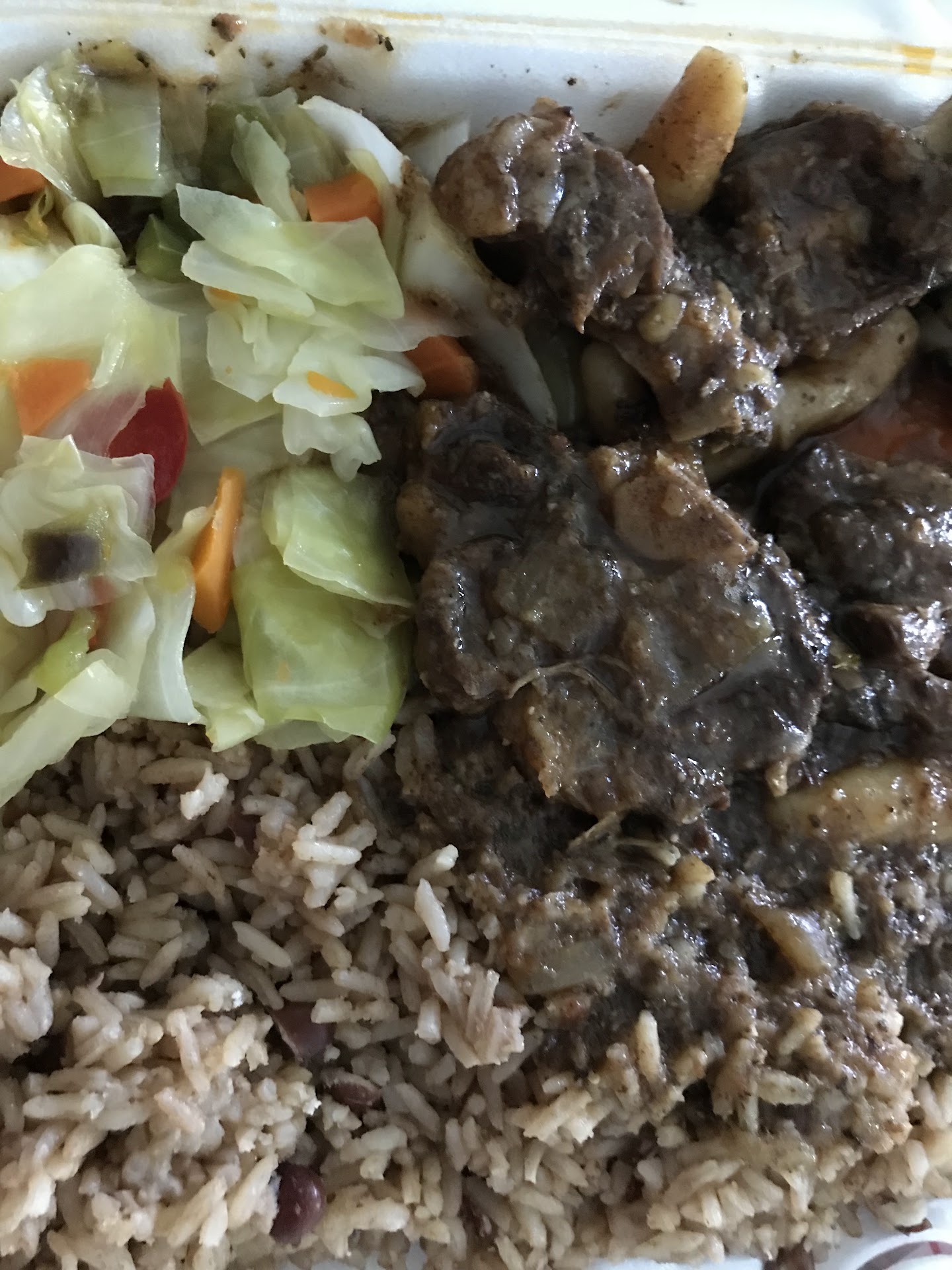 Now onto the food! Literally everything we ordered was amazing and tasted great. The Jerk chicken was cooked to perfection. It had the right amount of spices and was really tender. But the oxtails stole the show. I haven't had oxtails in over a decade and a half, and these were amazing. The sauce was so good that I was putting spoonfuls on my rice even after the meat was done. The rice was good and the steamed cabbage tasted really fresh. There was even a special sauce provided that is made by the owner, which is like a family recipe that is a purée of fresh vegetables! The beef patty and coco bread was awesome too. No lie, if we lived close I would be a regular...