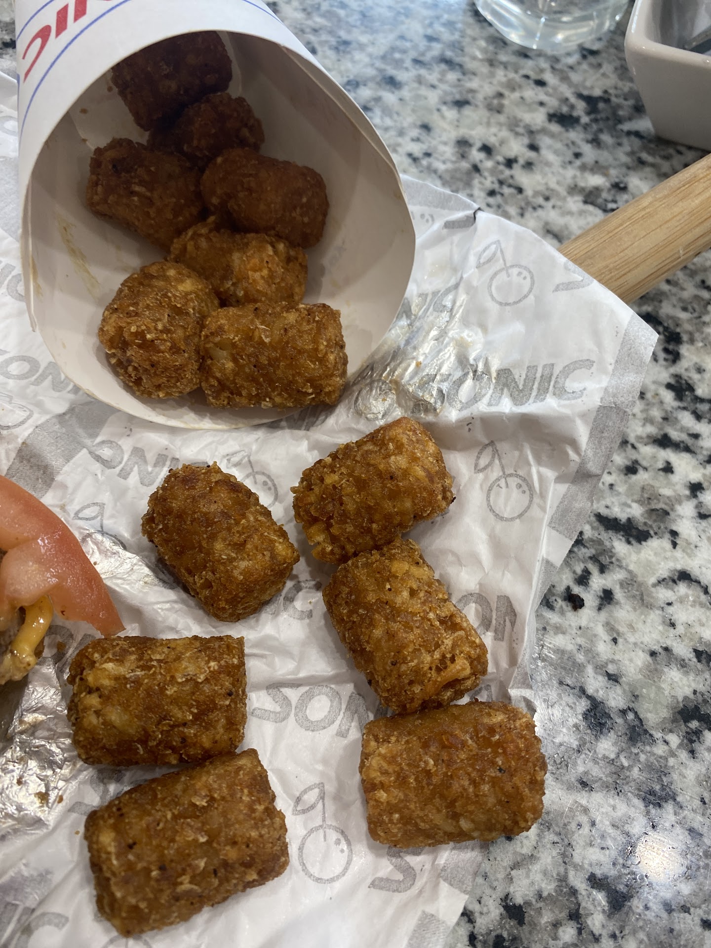 Read moreIt’s always a disappointment. I don’t think we’ve ever been there that the service was timely and the order was fresh or right. These tater tots, for example, are so clearly fried in old oil. They’re dark brown, dried out and so gross. There has been many times they’ve gotten our order completely wrong and they take forever. It’s probably the worst Sonic in the area. Longview Sonics and Henderson Sonics have MUCH better quality of product and service. I just have nothing good to say about Tatum’s Sonic other than it is a constant disappointment, which stinks since our options here are so few! Please find some people who take pride in their job. A little effort would...