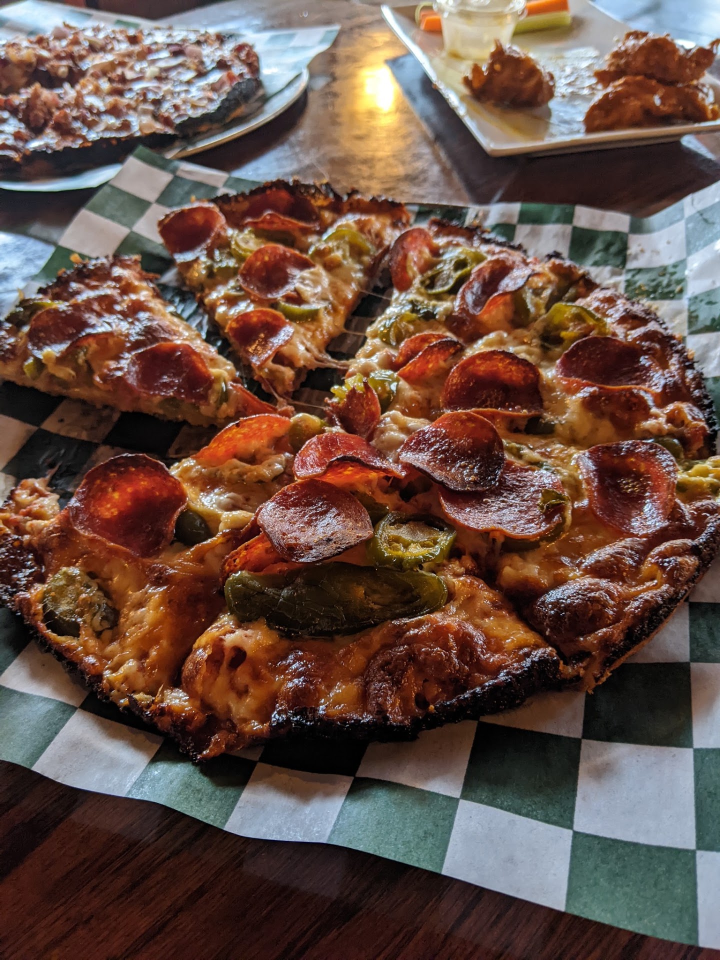 First time coming here and will be back! The location and exterior may seem sketchy, but a nice friendly staff and regulars await you inside. Started off with the gold fever tenders. Lightly breaded and definitely fresh. GREAT sauce. I got a BBQ chicken pizza which comes with onion and bacon. Ordered it crispy because I like a harder crust and was not disappointed. Most other bar pies or regular pizza places put some grilled chicken on top and drizzle with BBQ sauce, but this place puts shredded BBQ chicken UNDER the cheese and it's genius using that shredded chicken. It was spread throughout the entire pizza so I could actually taste BBQ chicken in each bite. Very good amount of crumbled bacon and red onion. Highly recommend if you like bbq chicken! My boyfriend ordered pepperoni, jalapeño and chorizo, crispy with burnt/laced edges. He really liked it but thinks the chorizo was a bit overpowering but I think that's a good thing. He usually does bacon so I'll chalk this up as just being too different for him. My only MINOR critique was that the cheese hardened quite a bit when it cooled, doesn't stay as soft as maybe Town Spa would but again, still only a tiny complaint. I prefer a blend with not as much mozzarella because it's a bit softer and flavorful but that will not keep me from coming back at all! (I used this same review on Yelp, it's not fake I just didn't want to type something different,...