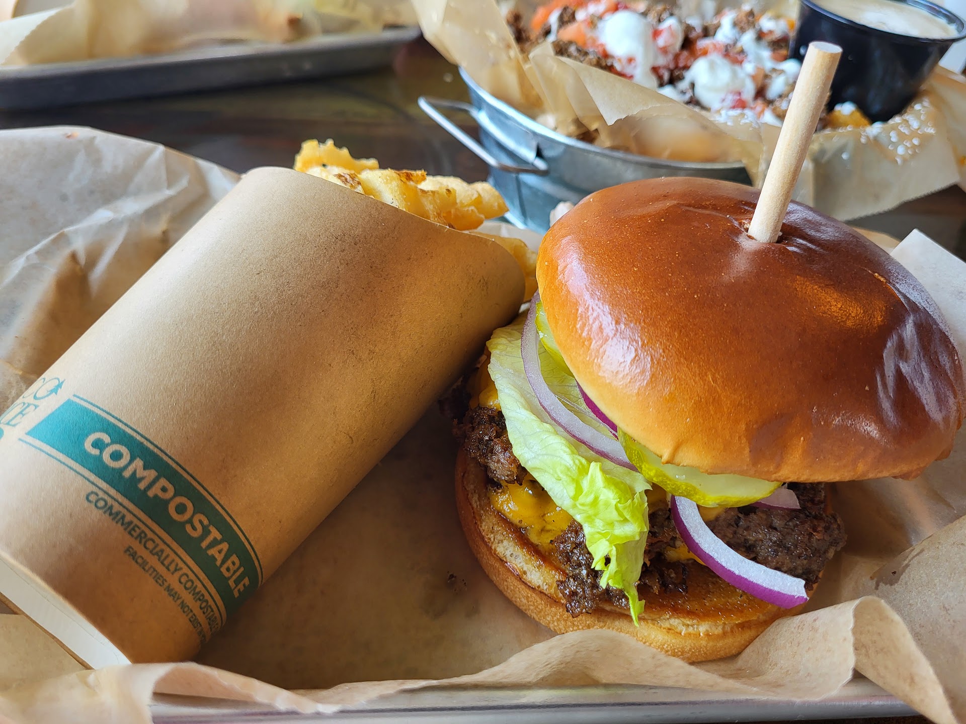 Read moreFirst time visitors to this restaurant. I heard about it from a barber that I reviewed elsewhere. Burgers tacos and waffles. They said it came from three different food trucks combining for a business. We showed up at opening on Saturday which was noon, and within 10 minutes eight of the 11 tables were full. We ordered the bad mother chugar, and their mega Mac Burger. And loaded fries. The barbecue on the chicken was not what we understood or expected, and that was our mistake. It was truly very spicy. It also had a weird consistency to us, not that they did something wrong, but it was very unexpected almost like a dry rub on a fried chicken. I had it later, as leftovers and it was actually really good but still spicy. The burger was great the not your nacho fries was enough for both of us actually. If we want it to be penny Pinchers we could have shared those alone. I am not a fan of the soft drinks that they served. They had some unbranded drinks and there was only one diet option, and it was really flavorless and bland and almost flat. And at $3.50 per soda I was not a happy camper on that. I give them a full five stars because they are niche and they try and their service was great their people were attentive but they still want you to stand up and pay at the counter and order at the counter, but then ask for tips at the counter before you eat and before you even see the service. As for drinks, there must be something with a liquor license because they handed you a drink menu but you had to physically walk outside the front door and into the concoctions place next door... That were actually connected inside to be able to order something like a margarita. It was very strange and unexpected and I didn't want to have to pay two different places to do a meal and drinks. So if they can work that out it'll be an added plus to the location. They are situated if you're sitting outside you might be able to see the seaplanes coming in and out from the seaplane rides. All in all a good experience I'm happy I am going to go back and try it again until we find a what exactly is our flavor. But the burger was great I'll give it that The burger was truly great and my wife was very jealous that she ordered a chicken that was too spicy for her and my burger was tasty...