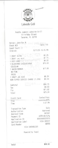 Read morePuddle Jumpers Lakeside Grill & Bar did a wonderful job making a private family event memorable and special for us! I wish I could give more than 5 stars. Jon and his team were with us each step of the way from answering initial questions promptly, showing us the venue space (although we live locally and dine there frequently), accommodating our load-in schedule, confirming the menu and drink arrangements which were priced well for the great value received and even listening to sound check with the most supportive event team members to ensure all went smoothly. We have visited with Brandi, Alexis and Sandy over the years, and were truly impressed with their level of care and service for our event. Brandi went out of her way to ensure all went as planned and has always been so kind and professional. Sandy did a fantastic job and is so pleasant, supportive and efficient. Alexis is excellent and so personable and professional. We cannot say enough positive things about our experience. This was a very important event for our family and guests and it was handled perfectly from our perspective. The food was excellent and there were lots of selections for different nutritional preferences. Our guests had a fabulous time, and we could not have done it without Jon, Brandi, Alexis and Sandy! What a great team. They even coordinated with team members not assisting with our event to help us achieve the best results with regard to our videographer and performance. We are most grateful and highly recommend this event...
