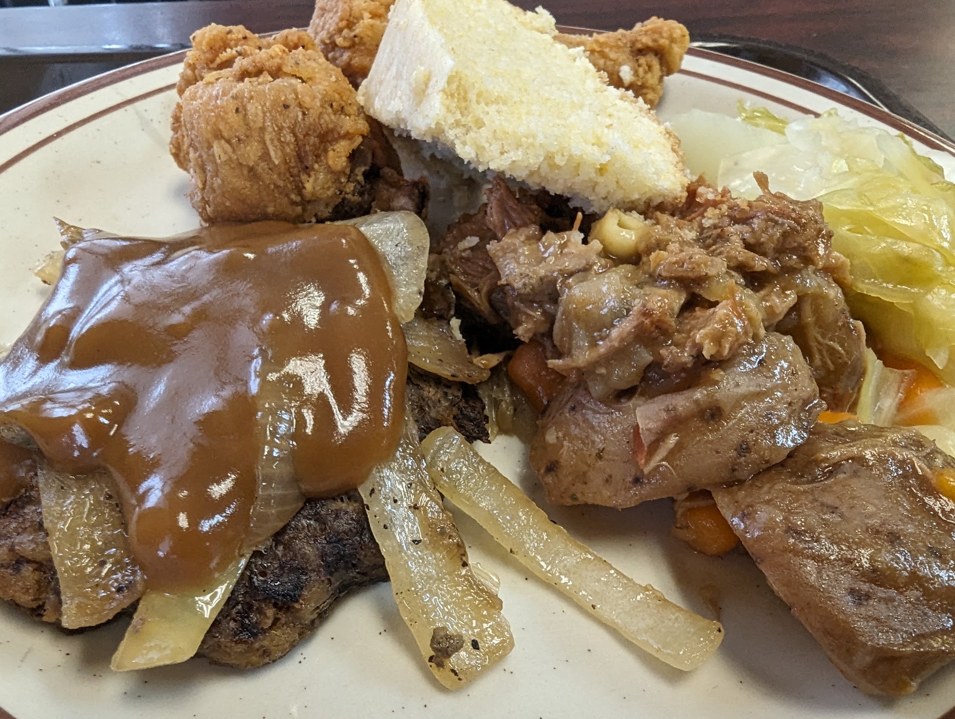 Read moreNot bad. Not great. Sides are better than Blue Plate's. Fried chicken is pretty good but definitely wouldn't consider it "southern fried". Only a very light dusting of unseasoned flour. The country fried steak tastes like a cheap TV dinner patty. Obviously a pre breaded and frozen product. Service however is very attentive and friendly. I've heard the AYCE catfish is good on the weekends and plan to try it for myself. I hope to be pleasantly surprised. Overall...for lunch, OK.if you're passing through, but l wouldn't go out of my way. They could stand to sweeten the deal by throwing in the drink... I don't often eat desserts, so l asked if l could just have an extra piece of bread instead. You would have thought l had asked them to donate blood, but they gave me one. I don't want to rock the boat so l just get the dessert now and give it to...