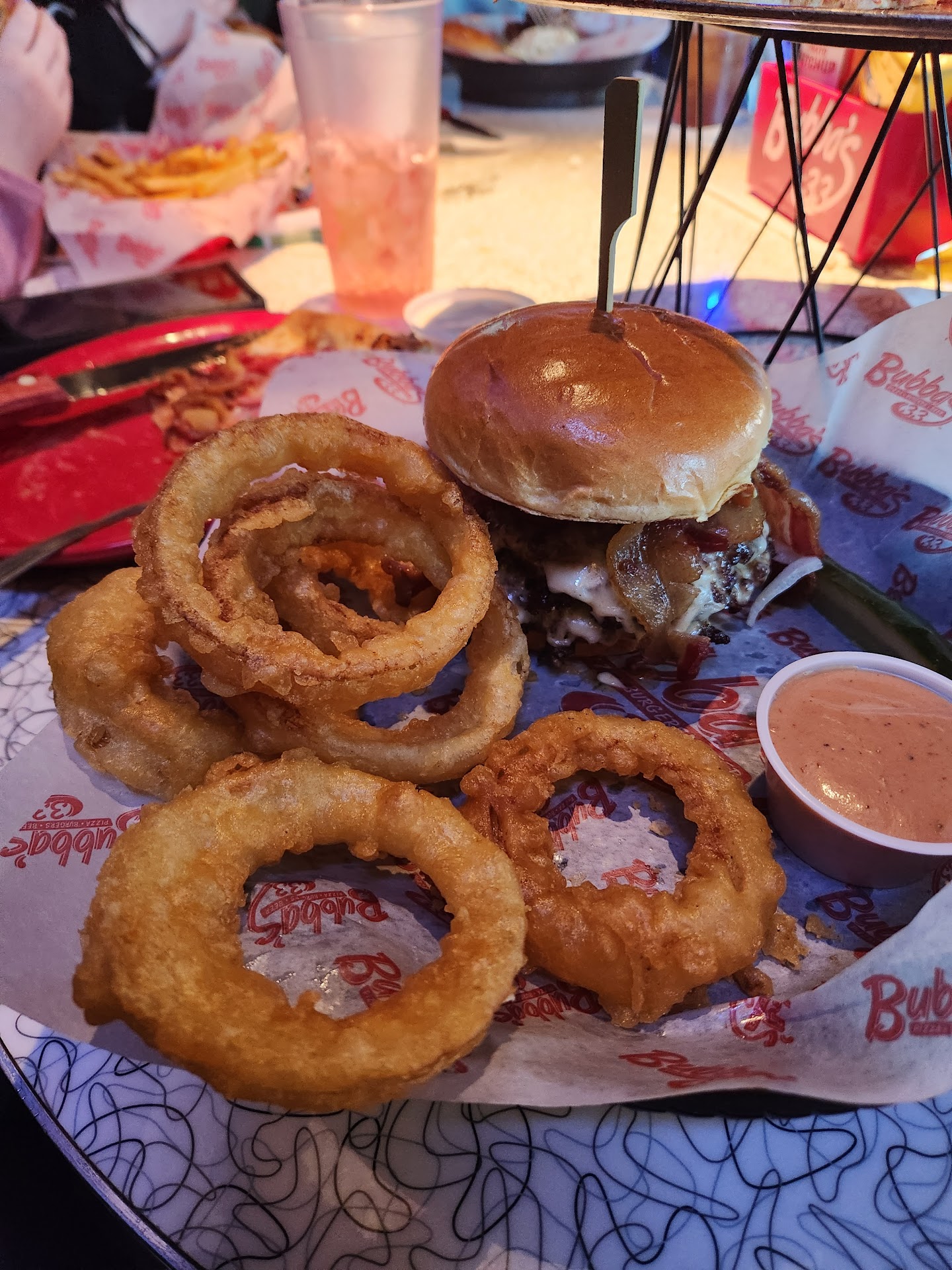 The burger was definitely the right choice. It was HUGH. Pictures were posted of him eating the burger. He almost ate everything. Only a small amount of the loaded cheese fries were left on the plate (took those leftovers home). I still had a piece of fish left and a bunch of chips that we took home as well.