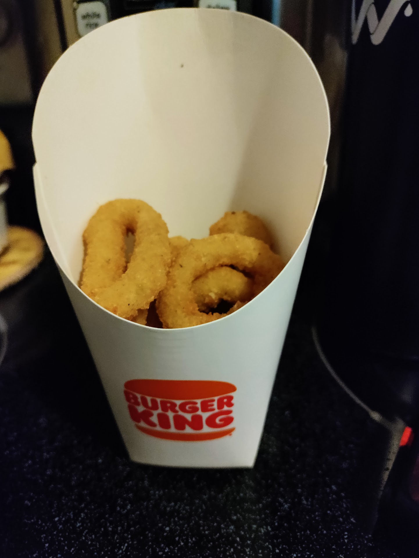 Read moreWent thru the drive thru @ approx 1:05 pm.. ordered #4.. no condiments.. Can I get onion rings instead of fries.. "what size" they ask... Large please.. what to drink.. and so forth.. rolled up to window.. paid for my meal.. my large pop was ready, he said just a moment for your food .. wasn't long at all., handed me my bag.. and off I went home.. After a long stressful day. (Yeah I start work in the wee hours) Get home and open the bag... This is a large onion ring? The container surely was but not the content.... I'm being generous saying it was half full .. yah know at today's prices.. I just got totally ripped Off.. and hey if u didn't have enough ready to fill a large.. ask me if I'd like to wait for gawds sake....... Yeah thoroughly disappointed... I'm half expecting to find condiments on my sandwich at this point.. nothing further to add, disgusted...