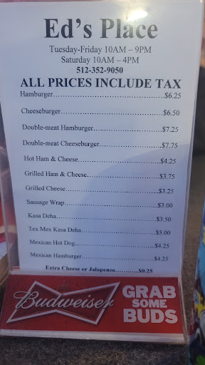 Read moreEd's has a very small burger/grill menu. Very basic, burgers, grilled cheese, quesadillas= spelled strangely on the menu. It's more of a neighborhood bar but they welcome all ages. Perfect juicy burger, bag of potato chips and a can of Coke cost $5-6 and is so much better than the chain burgers. Missing star is because they do not serve...