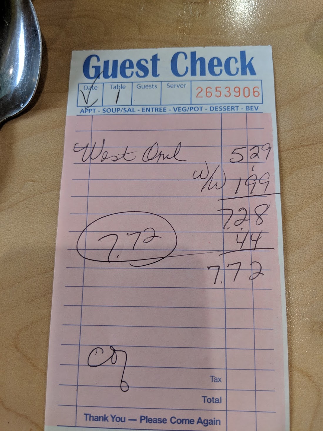 Meal Western Omelet Breakfast Special $5.29. this includes the Omelet, Potatoes or Grits, and toast Coffee $1.99 Total $7.72