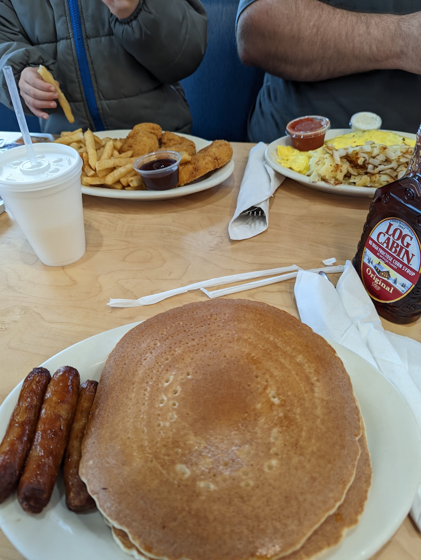 My omelet was a good size probably a three egg. It was cooked on a flat top grill evidenced by its’ shape. The green peppers and onions were plentiful and it included cheese. That makes me smile. Everything is better with cheese. The fried potatoes were cut into slices rather then shredded. They were nice and evenly browned and crisp on the edges. No visible grease on them. I usually select grits vs. potatoes, which is an option here, but was a bit hungry this morning. The coffee was pretty good. Better than most not the least bit bitter. Wheat toast was evenly browned and lightly buttered.