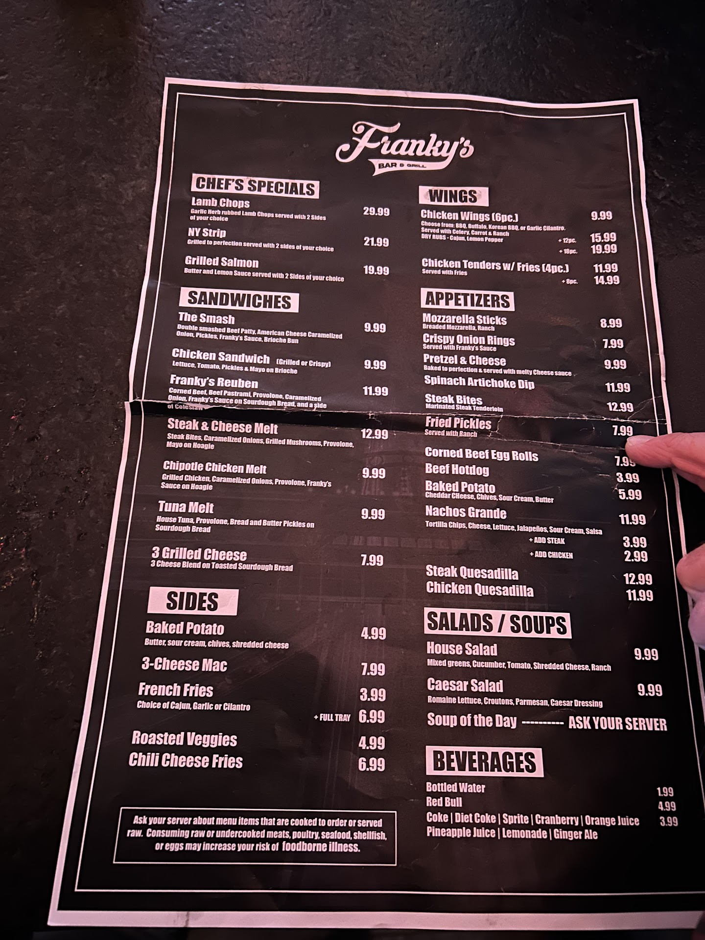 Franky’s is a relatively new bar who is looking to establish their roots in the downriver community. I know and understand that it cannot be an easy feat. I think a few tweaks could put our experience at a 5 star. My wife and I got lunch after we voted and ran some errands. We heard that the burgers and the wings were spectacular so we took a drive from Woodhaven to Dearborn Heights to give it a shot. We arrived at the time of opening so I know that it can be a bit chaotic in the sense of getting things together and organized before serving guests. The bartender who served us seemed a little overwhelmed with her duties and had a hard time even taking our order which was pretty basic. Also there are is no menu which takes away from my experience personally. My wife and I both ordered the smash burger, her’s was supposed to have sauce on the side. We also ordered a side of garlic fries and a 6 piece bone-in wing, with garlic parm & buffalo sauce on the side. After about 5 minutes, they brought out a box of onion rings (which we didn’t order) but told us we could keep them, they didn’t have to do that. They were decent, nothing too crazy I mean it’s onion rings lol. Then shortly after that, they brought out a carry out box of a burger and fries. The burger had no onions and no pickles on it, and we were still missing the other food so I waited for my wife to get her burger which was well over 10 minutes from the time we got the first burger. They took mine back and said they’d fix it, they only put onions on it so I asked for a side of pickles. My wife’s burger eventually came out, we were just about ready to go at the point. The wings came out last and they had the sauce on them, but only the garlic parm & the wings were dry as all hell and hardly had any sauce on them. I gave the place a 4 when it really should be a 3/3.5 at best. I can tell they’re trying and I can see the vision as well but I think if some hiring changes were made, it could make a world of difference. The bartender didn’t tell us her name either and I think if she were to write things down she wouldn’t forget as much but who knows. Not trying to be picky but in the economy we live in today, I would like the money we spend to treat ourselves out to eat to be worth while. The owner was kind and apologetic also. For two people, our lunch was $52 including tip with no alcohol. I think it was a little overpriced but then again so are most things in...