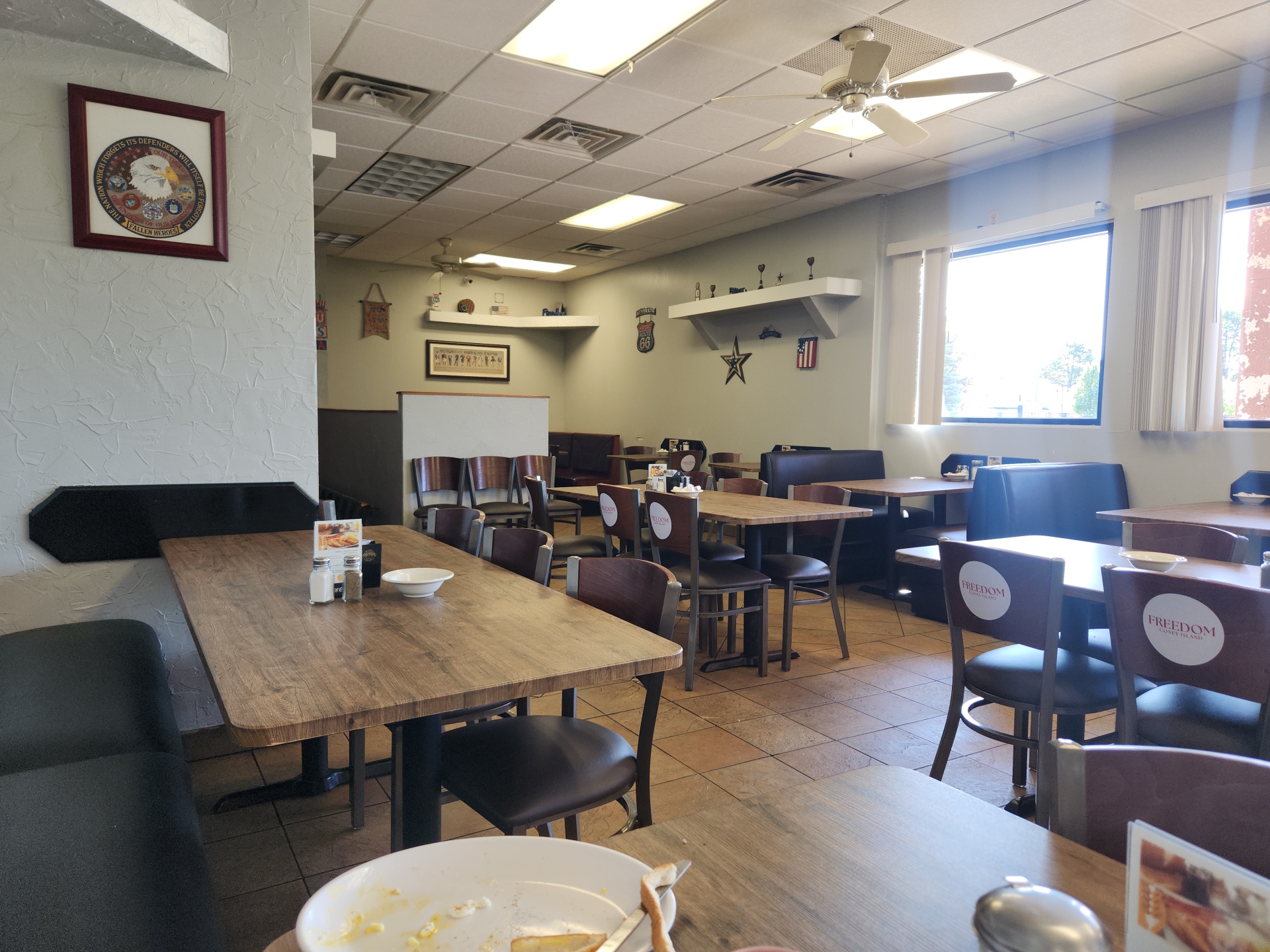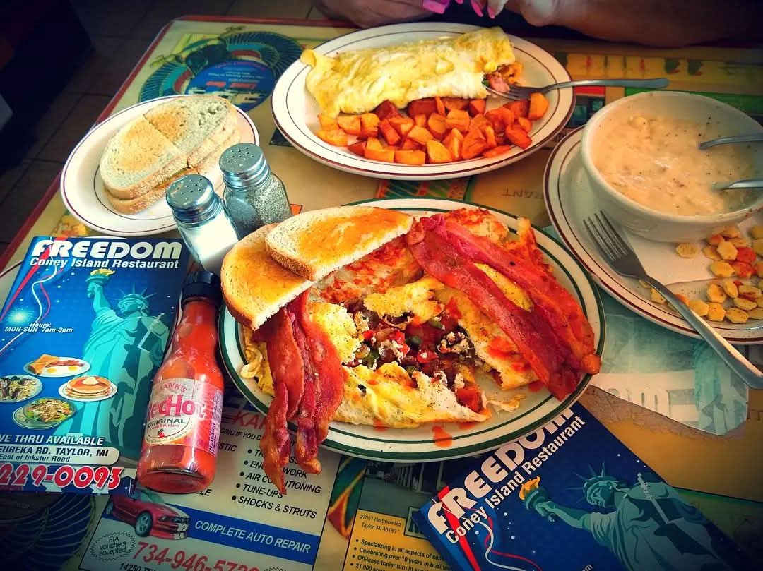 Read moreMy husband and I stopped here for a late breakfast. To say we were very satisfied is an understatement. The food was great! I ordered pancakes and they were light, fluffy, golden brown, and full of flavor! My husband ordered the the Ultimate Freedom Omelet, and it was amazing. Full of flavor, not weighed down and perfectly cooked. Now, the customer service was even better than the food that fueled our bodies and comforted our souls. I spilled my coffee all over my table and legs, and no less than 3 waitstaff came to my aide. Napkins, cleaning towels, and of course, more coffee. The atmosphere is busy, yet it still shown clear that the people in the restaurant loved and took pride in what they did. As a person that typically drives by a restaurant with a worn sign, for fear of the people and food being the same, I am happy we stopped by this place. Don't sleep in this restaurant, you WILL NOT beat the food,...