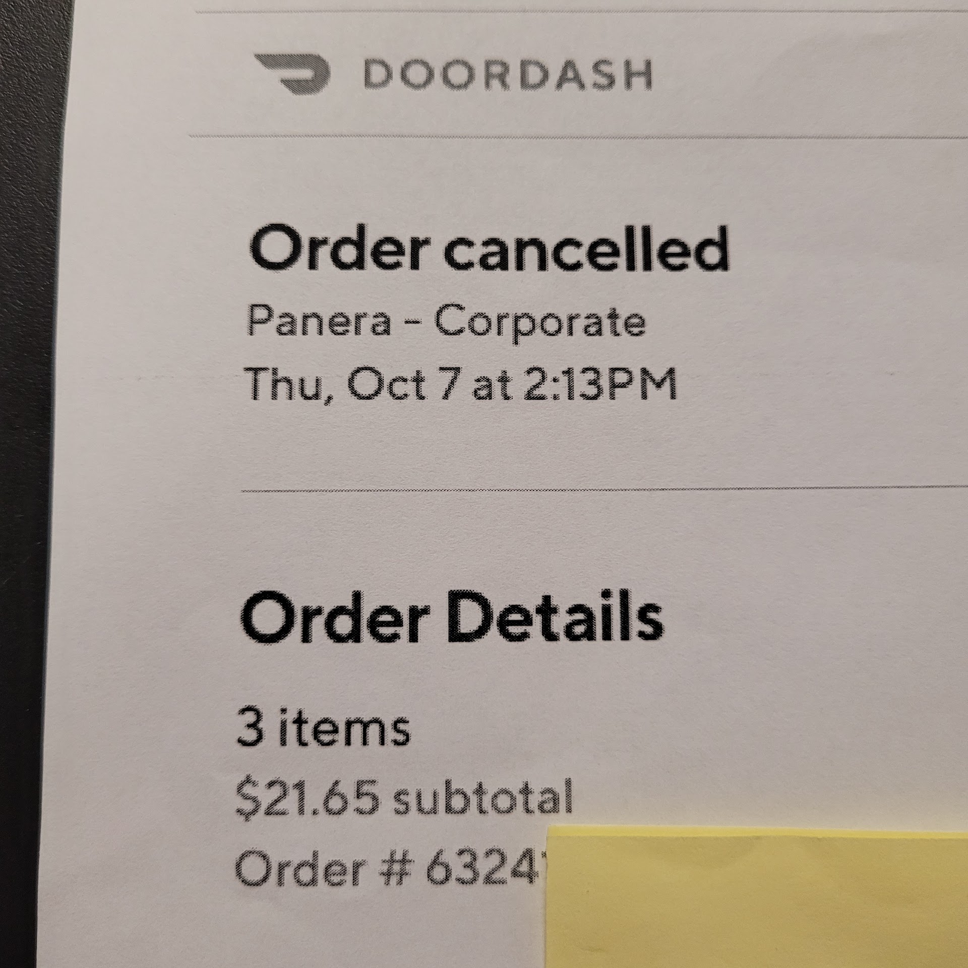 Next step, call DoorDash to find out why no one from there never called..... apparently the dasher marked the order as never picked up cancelled AFTER PICKING IT UP AND DELIVERING IT TO THE WRONG PERSON!!!! DoorDash kept insisting that the restaurant was closed and that is why the order was cancelled (by tome stamps on emails it was 30 min after I placed my order)... um nope, here I'll call them for you on speaker (and I did so) and Panera relayed my issue is not the only issue they have experienced today apparently it has been occurring ALL DAY with DoorDash.... again DoorDash continues to try and make excuses saying well the store is closed...uh, no I just had them on the phone while you were on the phone too...anyways lesson learned, I'm just gonna pack my lunch from now on as this is not this first incident experienced with DoorDash, unless a location has their own delivery system, like a...
