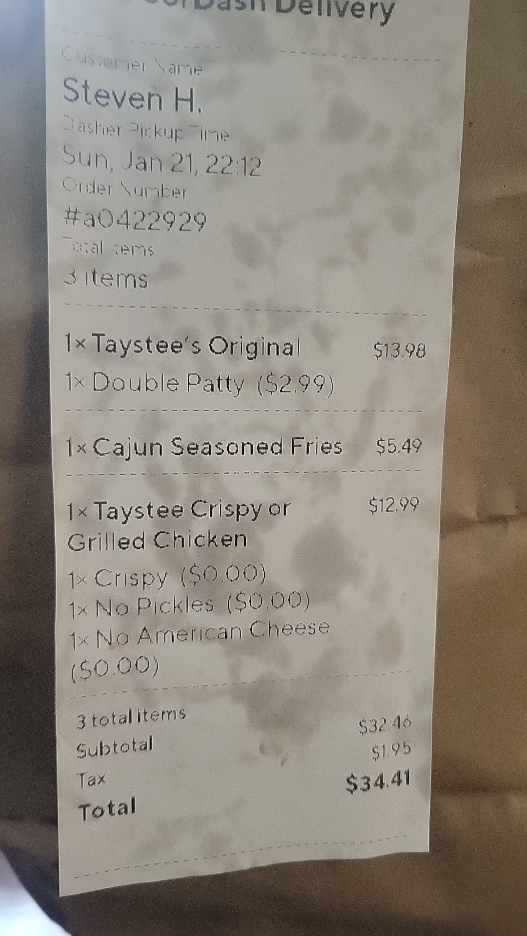 While I did hear the name wrong and that’s on me, there weren't any checks in the process to prevent this from happening. I was not given either a paper receipt or an order number when I ordered to verify. The room is also huge with high ceilings and quite loud, so it's easy to mishear when an employee isn't projecting their voice 30 feet or so away. Fryers are going and people are having conversations. The employee also did not confirm who I was once I walked up, she just gave the order to me after hearing the name from a distance, despite me being clearly the opposite gender from the name on the order I mistakenly took. The receipt showing what was in the bag was also not stapled to the bag or on the top in the bag, it was at the bottom. So, I had already opened both the bag and the items by the time I could tell there was a mix-up. If Taystee had taken any one of these steps (that most other businesses have in place) they could have easily prevented this mix-up.