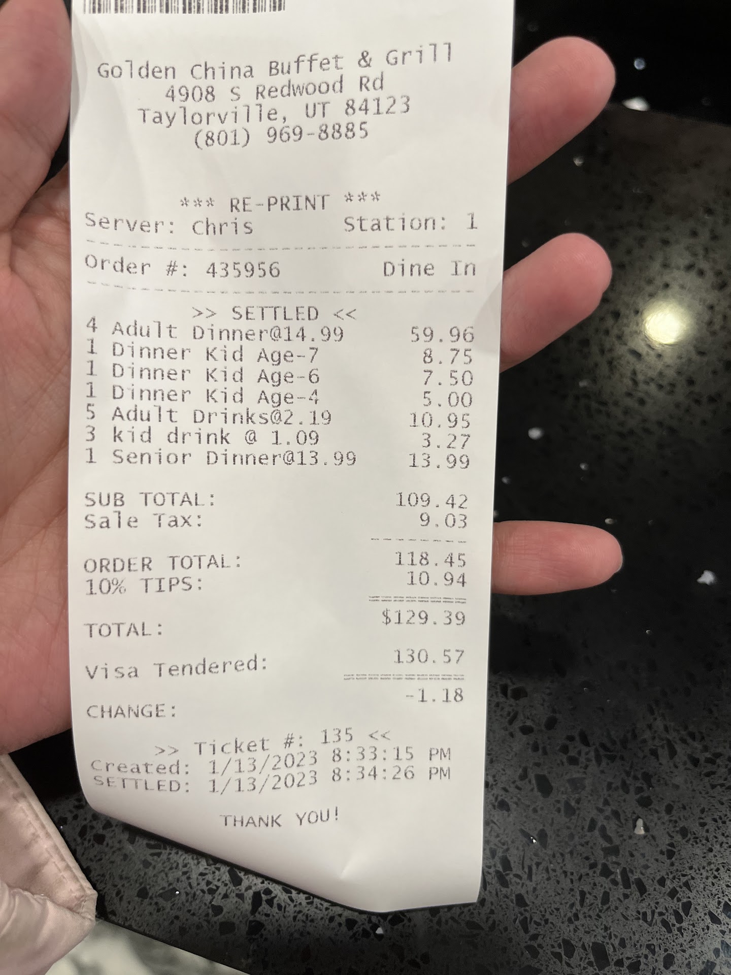 Read moreTook my family for dinner for a special celebration was shown ignorance disrespect by the drink/table cleaning employee she was a woman in her 50's with grey short hair white lady she had a negative attitude when she came to our table spilled water right away numerous times all over our table without apologizing without cleaning it up the first time it was a forth glass of water all over our plates silverware the second time was a half glass of water that covered the majority of the table leaving my young son with autism clothing soak and wet. She never apologized at any time not once not even to my family member with a disability all we got was a sarcastic oops and repeated behaviors from this employee.She also left dirty dishes on our table numerous times and refused to collect them so we can have room to eat along with a clean table to eat on This server behavior and ignorance clearly is unprofessional prejudice against multiple colors of people just out celebrating a young individual with special needs special day.Mind u during this whole disappointment experience I kept telling myself I'm going to be the bigger person and not at say something rude to this employee who is showing ignorance towards my family for no reason. this Taylorsville location has only been there for barely a year I will NOT recommend this location as long as they have unprofessional employees like that lady with that attitude and behavior...