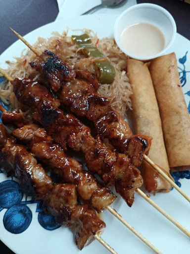 We ordered bbq on stick with pancit & lumpia, Burnt ends with steamed rice & lumpia & beef stir-fry with curly fries & rangoons + bottled drinks. The lumpia rolls were piping hot with a nice crisp. It came with yum yum sauce but even with that, it didn't help very much; they were flavorless. It would've been better paired with banana ketchup or sweet chili sauce like how Filipinos eat their lumpia. It was weird dipping them in yum yum sauce as you'd normally see them paired with hibachi dishes at a Japanese restaurant. The beef stir-fry's flavor was ok but not great. For $16.99, the plate looked more like an appetizer sampler than an actual entree with 2 sides. I thought the steamed rice would be better with burnt ends but I was disappointed. It was too sweet like original bbq sauce sweet but with more added sugar. I wasn't familiar with the taste. I wanted to like it but honestly I would've settled for fried pork with soy sauce and lemon on the side rather than the pork swimming in extra sweet bbq sauce. The pancit was al denté. It's got some umami flavor to it and it would've worked better had they put a slice of lemon on the side. It came with bellpeppers. I've never had pancit cooked that way before. Back home in the Philippines, you'd find pancit sauteed with onions, julienned carrots, cabbage, snap peas, protein and lastly, the citrus called 'calamansi' on the side. Hence why it was an odd combination for me. The bbq pork on a stick saved the day. It was fresh, glistening and had a sweet smokey flavor to it. That at least we enjoyed. The closest thing to bbq stands in Manila or other major cities in the Philippines.