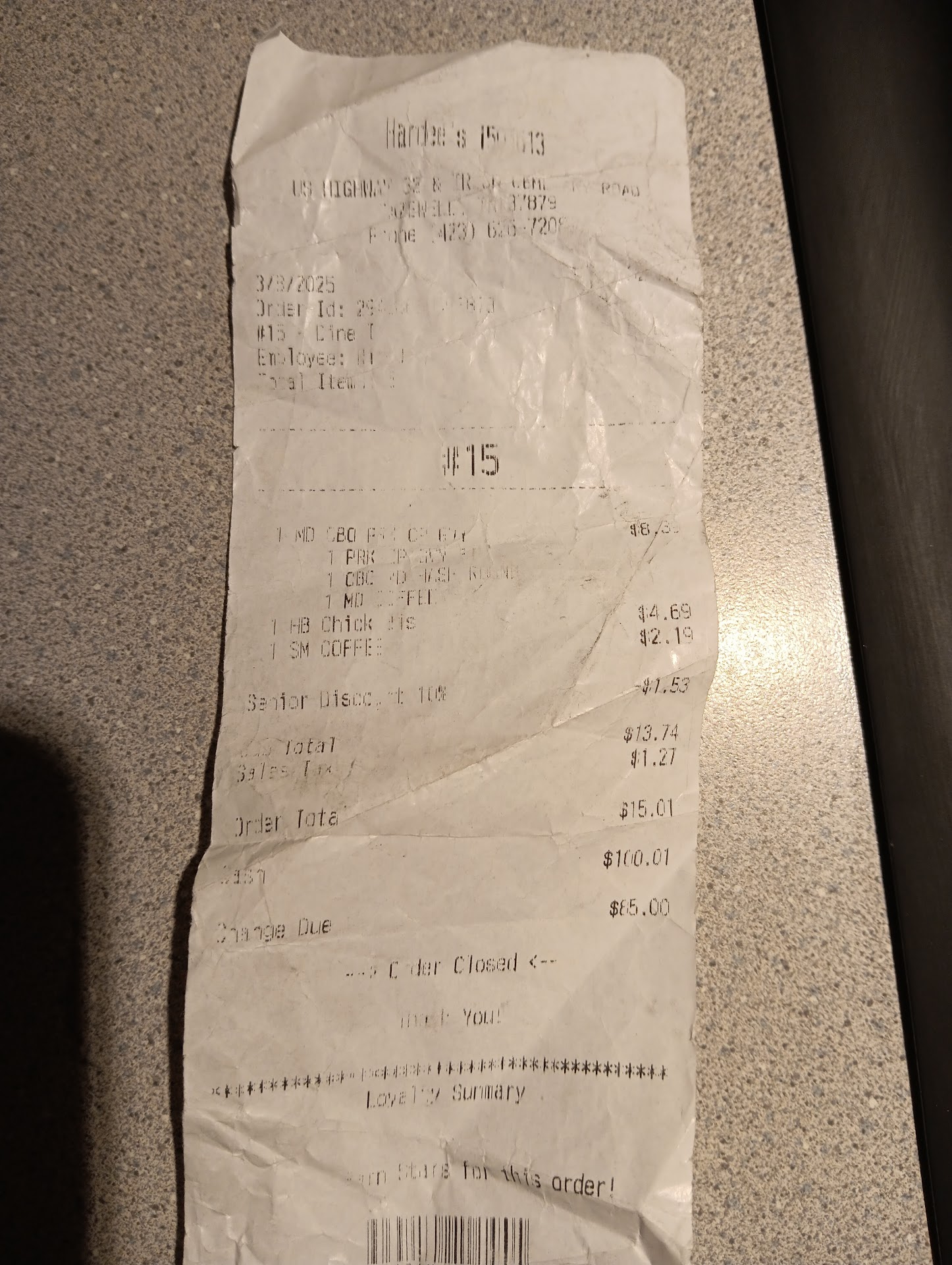Read moreOrdered breakfast to dine in, our ticket was hanging there and the people putting out the orders, seem to overlook our ticket for 19 mins. People who ordered after us, whether dine in or carry out got their food almost immediately. I had to ask 2 times about when we would get our food. Then they gave us the wrong order. Very frustrating, but did not get angry, or make a scene. I just think, if I am going to spend my hard earned money, it should be worth, in this case it definitely was not worth it. Side note, the coffee was colored water, you could see bottom of the coffee cup. And the breakfast biscuit were thrown together hastily, our hash rounds were scattered across our tray, cause the container came apart. Honestly, the employees just acted like it was a burden for them to get our food together. The young lady who took our order was very polite. Hardee's will no longer get any business from me but I am sure they won't worry to...