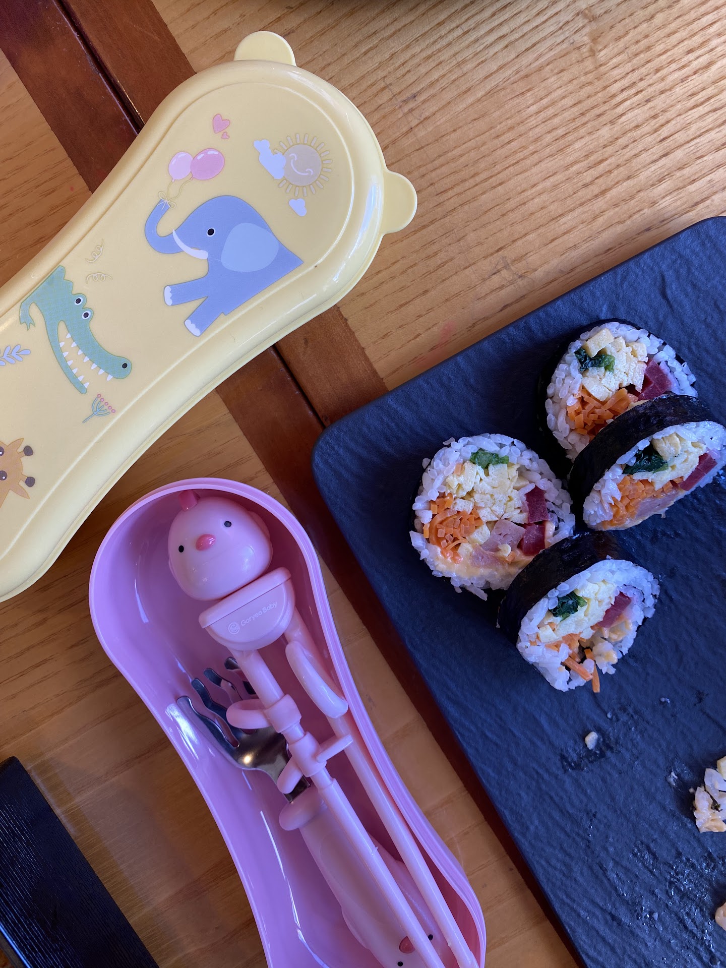 One thing I definitely want to emphasize is that this restaurant was extremely kid friendly! The restaurant had a Stokke type high chair for my youngest that was super clean and comfortable for him. There were so many options for my kids on the menu between kimbaps and even dino nuggets. Lastly, when bringing out all our food, the waitress brought out the cutest utensil sets for our kids to eat with.
